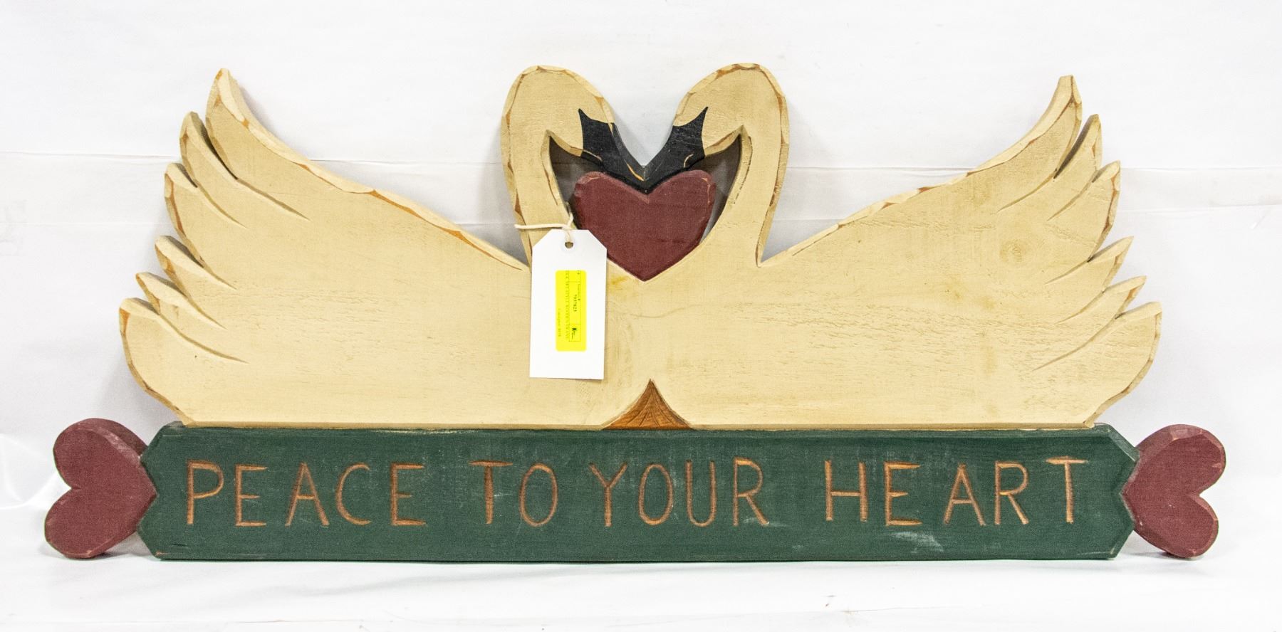 LARGE “PEACE TO YOUR HEART” WOODEN WALL HANGING WITH CARVED SWANS. MEASURES APPROX. 16 X 37.5 X 2 INCHES. **ALL ITEMS MUST BE REMOVED BY 5PM SATURDAY, FEBRUARY 25TH 2023. ALL REMAINING ITEMS WILL BE SUBJECT TO A $6.00 PER DAY STORAGE CHARGE. ANY ITEMS REMAINING AFTER MONDAY, MARCH 13TH, 2023 WILL BE CONSIDERED FORFEITED. NO REFUNDS WILL BE ISSUED FOR FORFEITED ITEMS. TO SCHEDULE A PICK UP APPOINTMENT CLICK HERE
