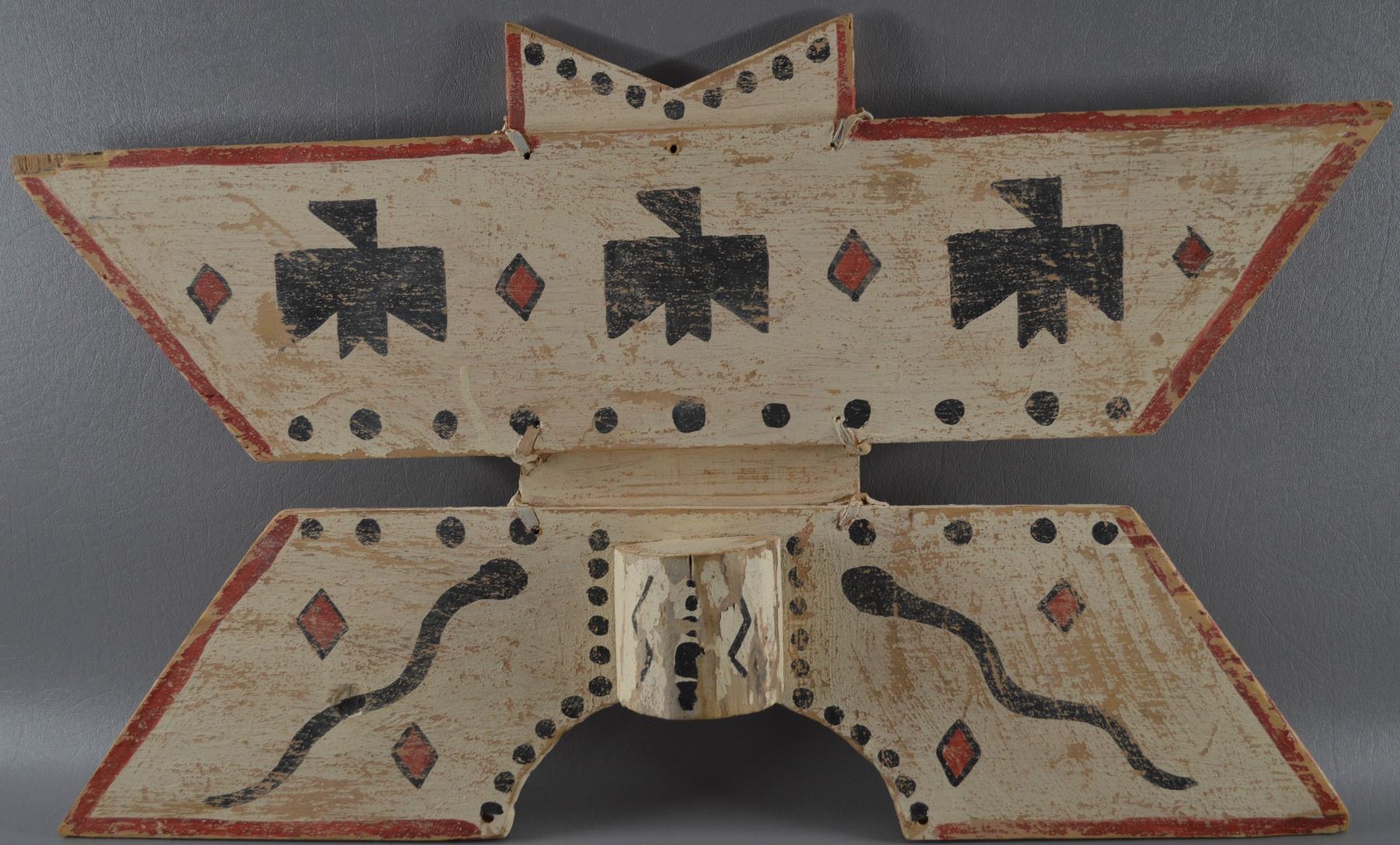 1970's. Made from wood with painted thunder bird and snake design on front. Has chip and paint loss. 24" x 14.5"