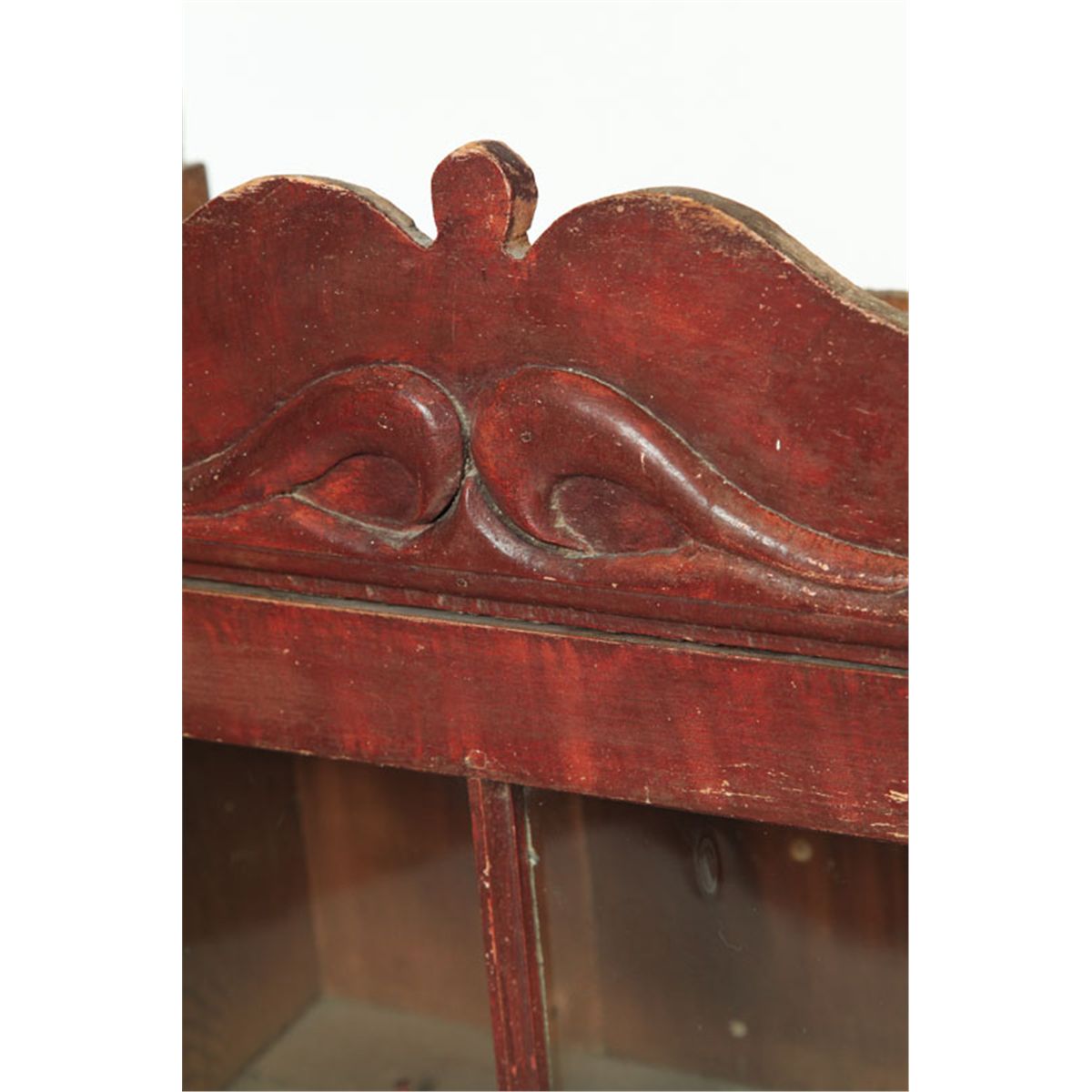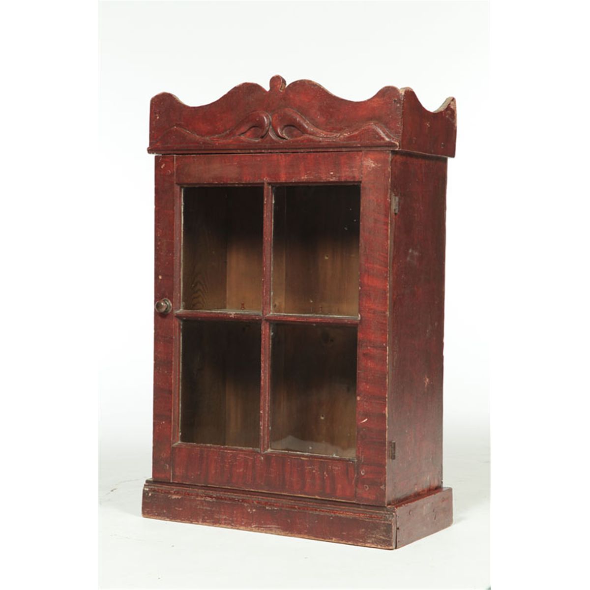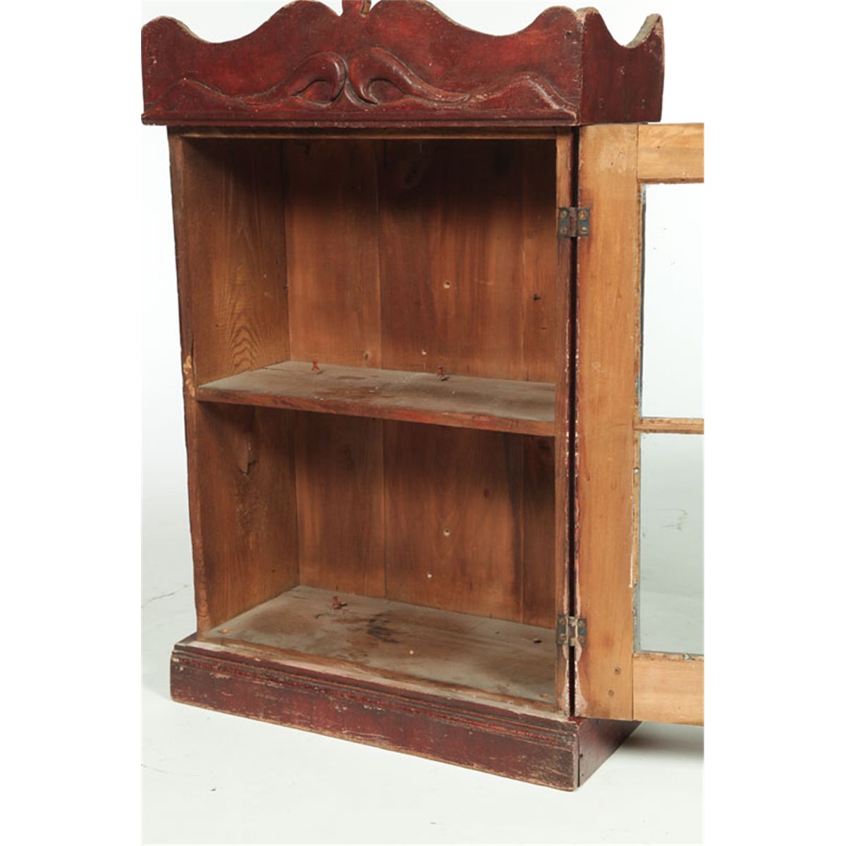 Possibly Midwestern, 19th century, cherry, chestnut and poplar. Four-pane door under a shaped crest with applied carved details. Retains its original red grain paint. Lower-left molding replaced. 34 1/4"h. 22"w. 9 1/2"d. Sold at Sotheby's (New York), June/July 1982, ex Don Walters (Massachusetts).