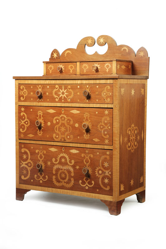 Probably Midwestern, mid 19th century, walnut, curly maple, and poplar. Diminutive size, with a broken-arch backsplash over two glove drawers over three long drawers. Elaborately inlaid with stars and scrolls. Imperfections. 42öh. 29 1/2öw. 16"d.