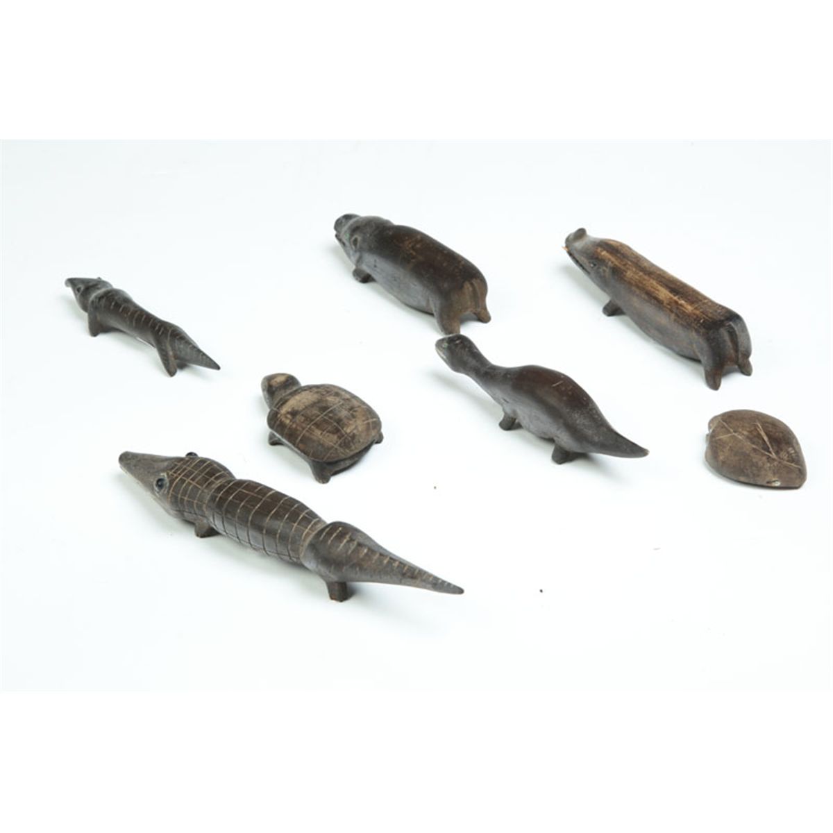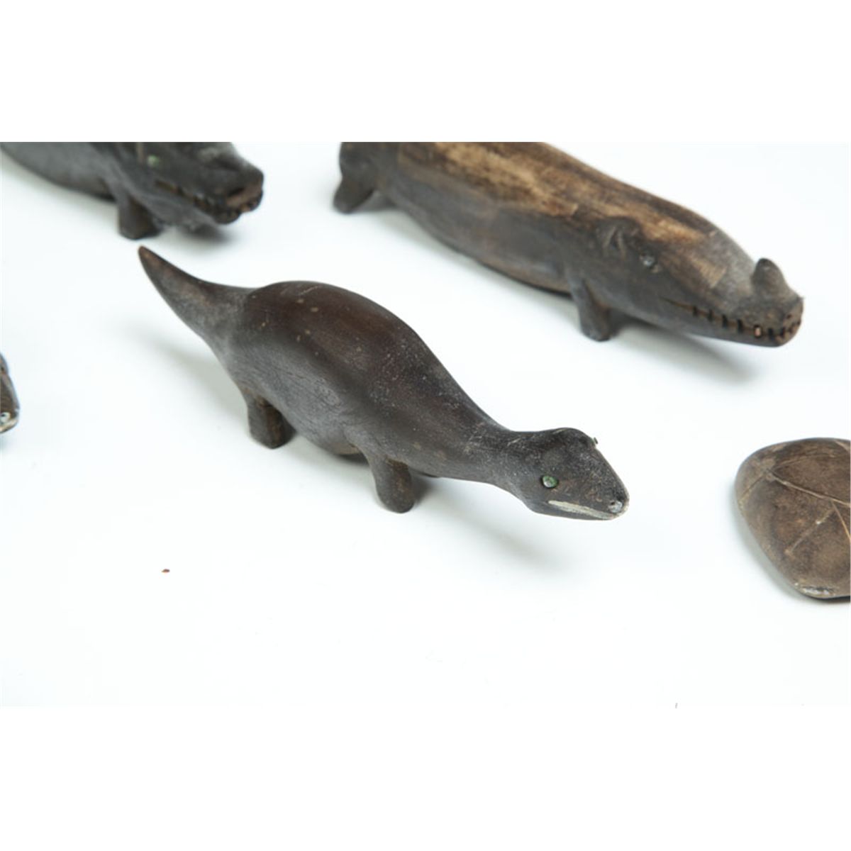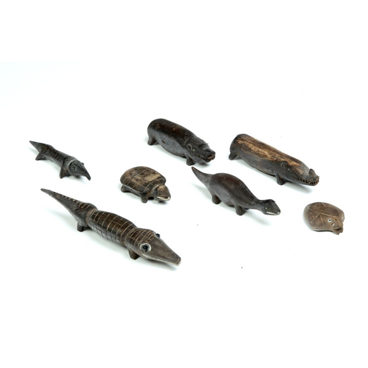 American, early 20th century, softwood. Includes a warthog, crocodile, hippopatomus, lizard, possibly an aardvark, a turtle, and a crab (missing legs). Original painted surfaces. 2 1/2"-9"l. Ex Tom Rawson (Iowa). See also lot 508.