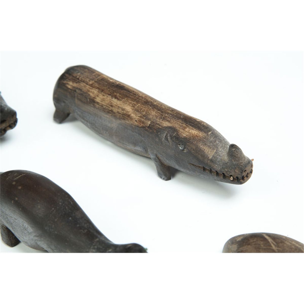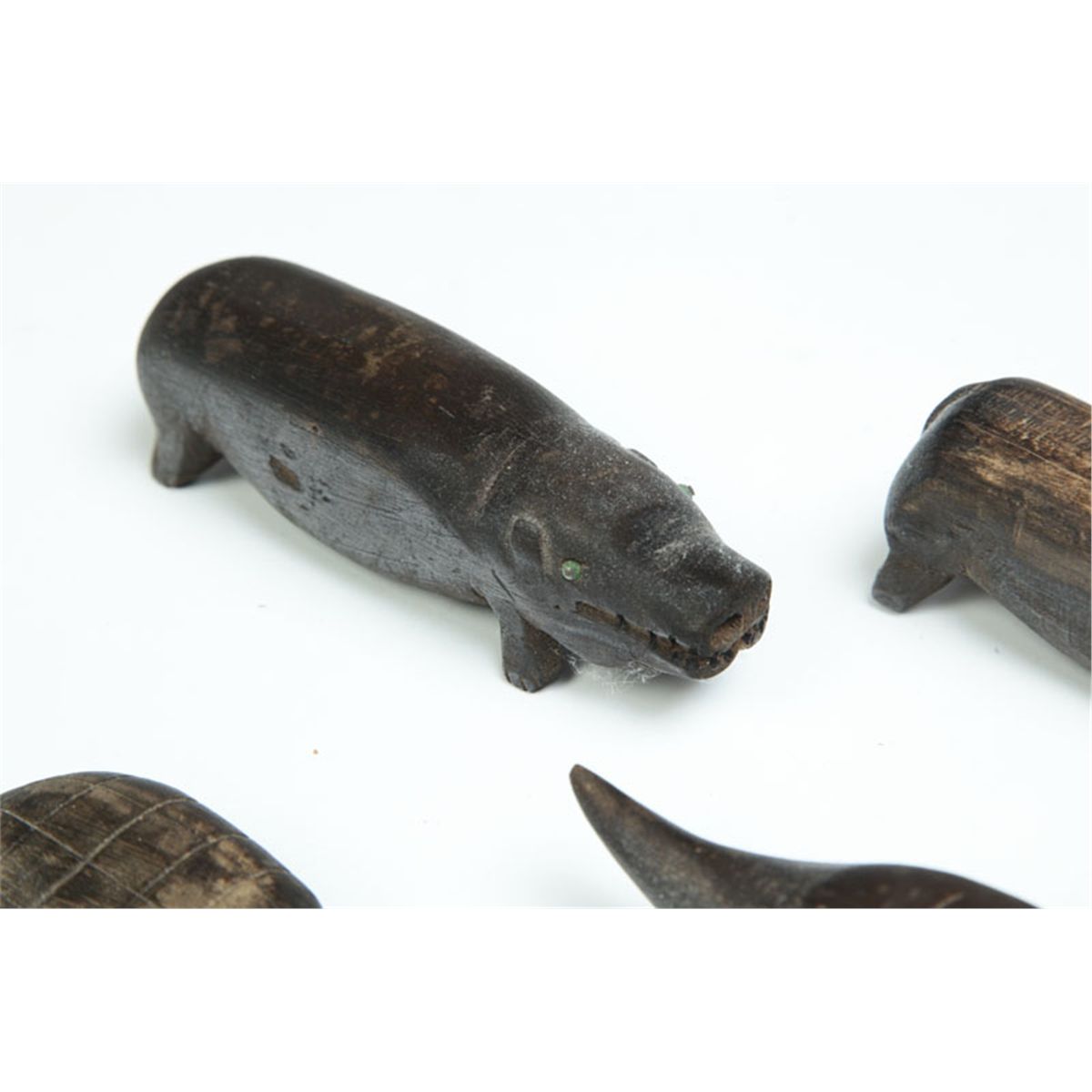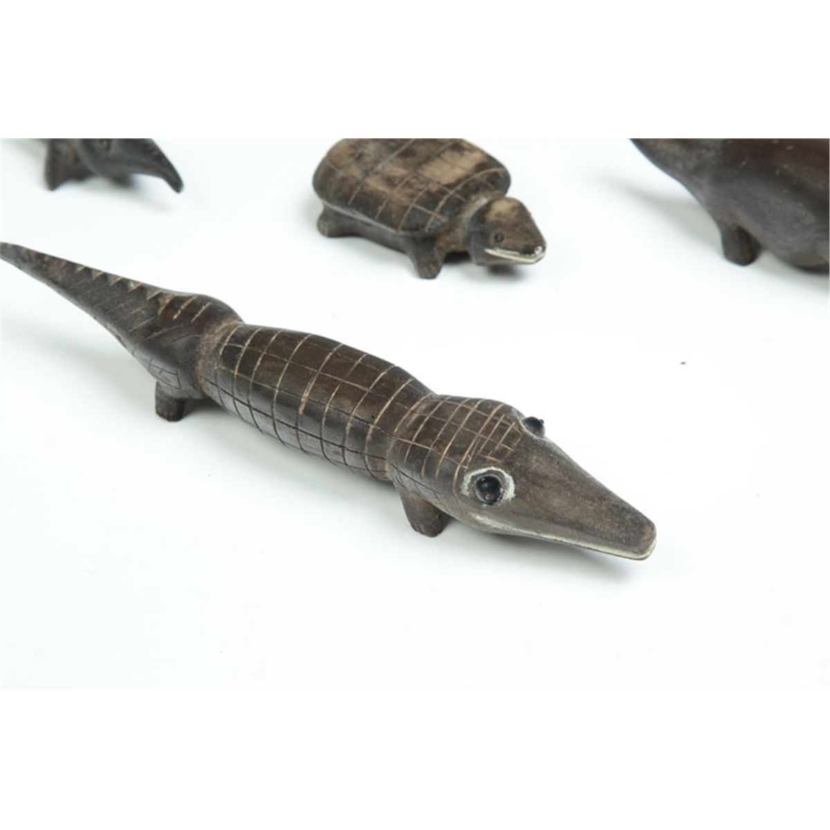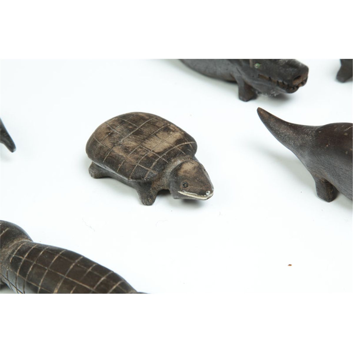 American, early 20th century, softwood. Includes a warthog, crocodile, hippopatomus, lizard, possibly an aardvark, a turtle, and a crab (missing legs). Original painted surfaces. 2 1/2"-9"l. Ex Tom Rawson (Iowa). See also lot 508.
