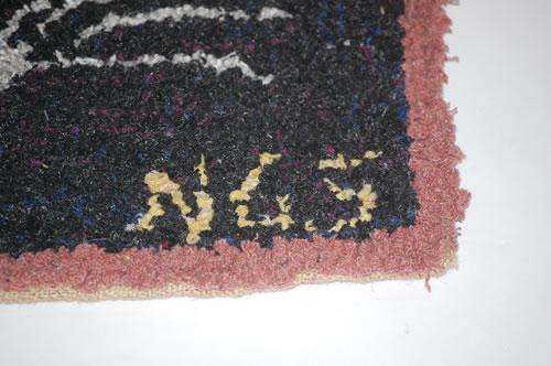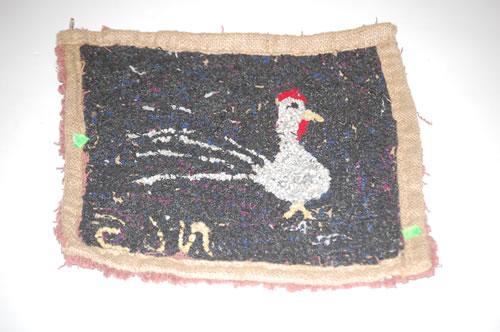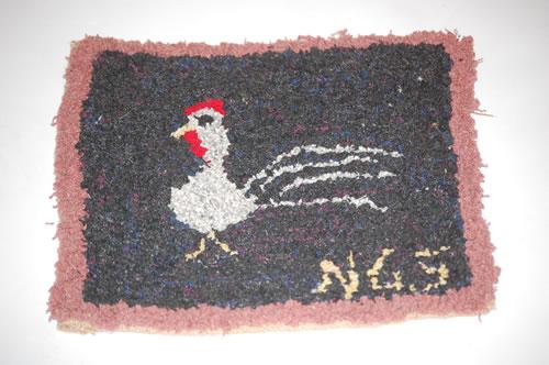 FOLKY FIGURAL HOOKED RUG - CONTEMPORARY FOLK ART HOOKED RUG W/ WHITE ROOSTER ON A DARK BACKGROUND- SIGNED NGS (NANCY GERTRUDE SCOTT OF ME)(14 1/2" X 14 1/2")