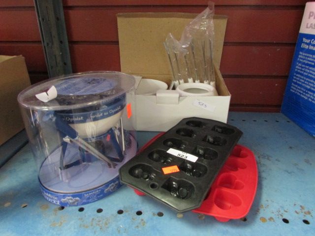 FONDU SETS (2) & JELLO MOLDS (HEARTS & SKULLS) VINTAGE JAR, SP TEA SET & DECANTER