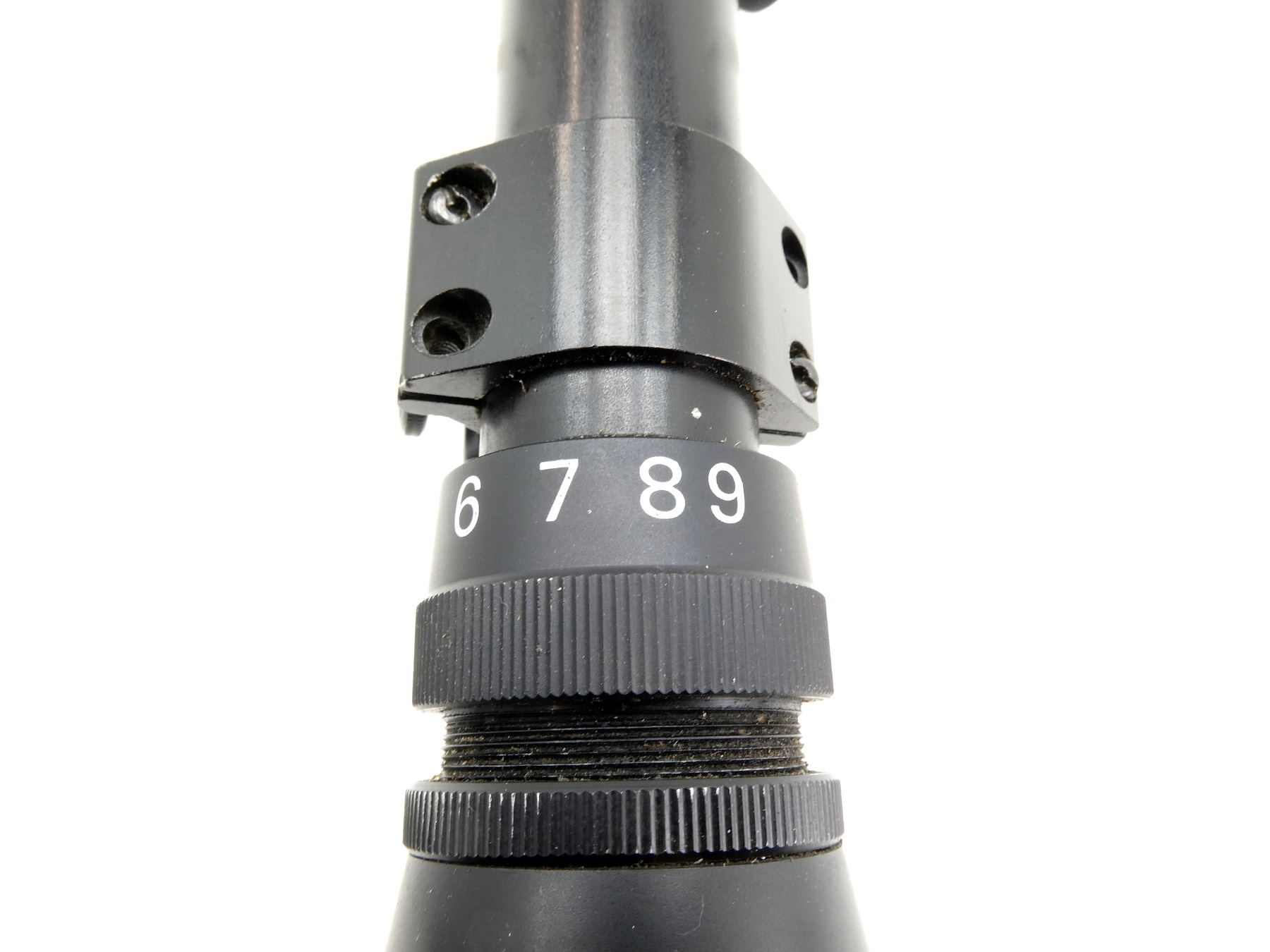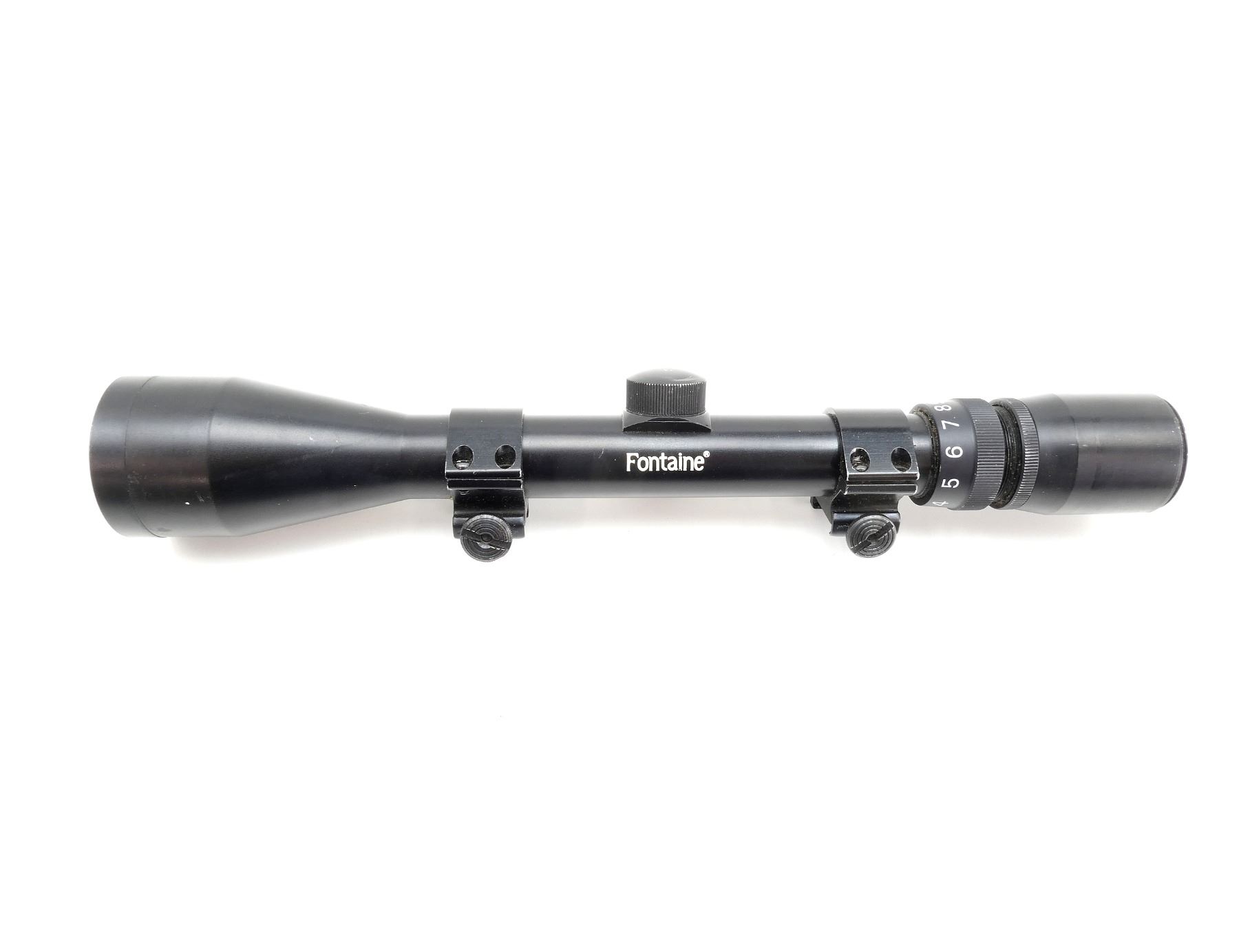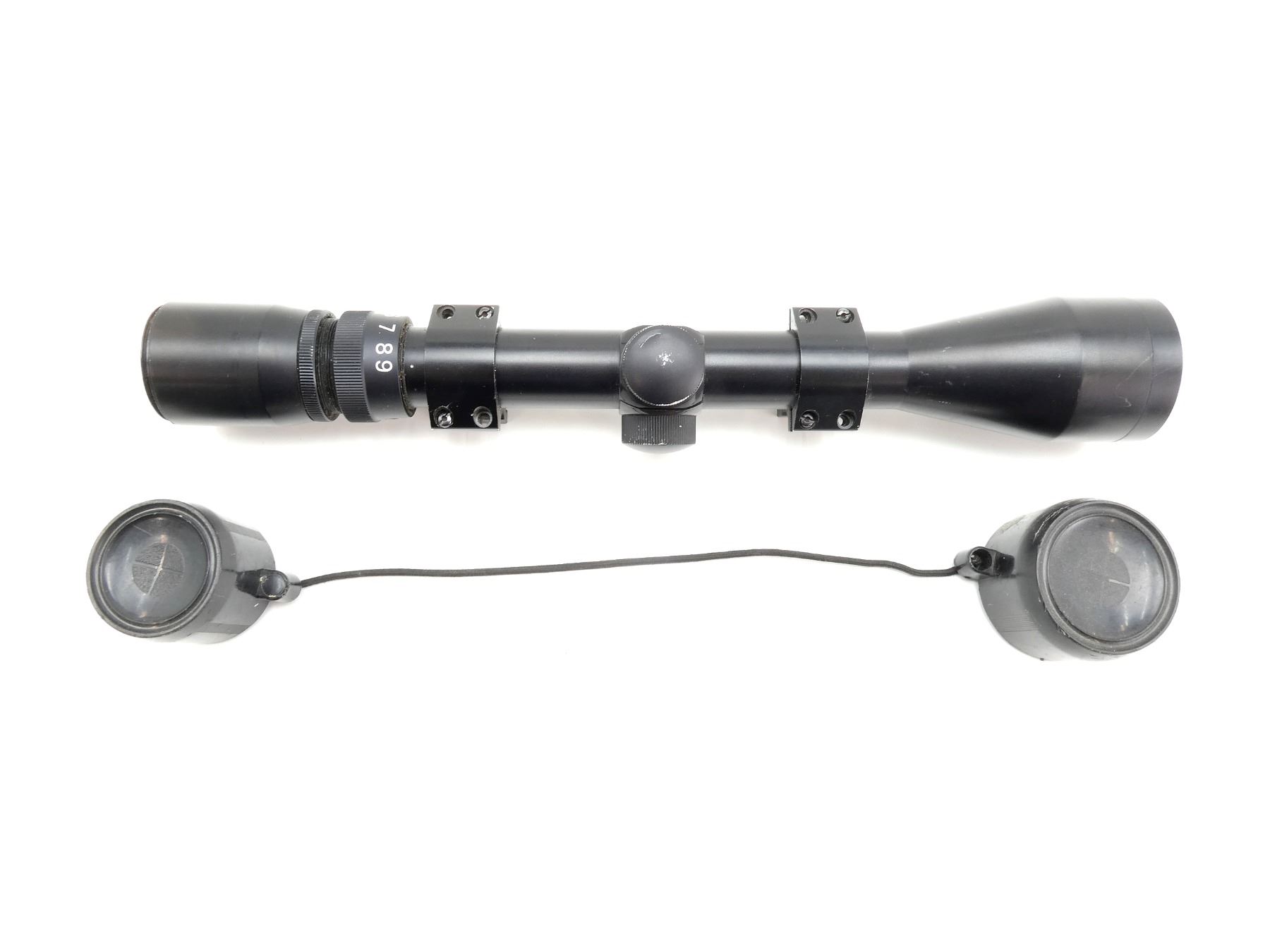 (1) CLEAR OPTICS, DUPLEX RETICLE, 1" DIAMETER TUBE, WORKING MAGNIFICATION RING, WINDAGE & ELEVATION KNOBS TURN, MARKED: "3940", WITH SCOPE RINGS & FRONT / REAR BIKINI CAP COVERS, SHOWS WEAR & TEAR / USE MARKS. SEE PHOTOS.