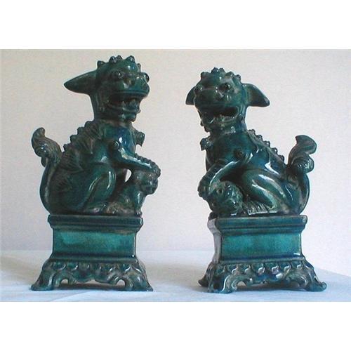 This pair has a rich deep mellowed turquoise glaze with wonderful color variations. The Foos display beautifully. Grest for investment potential.br> Dimensions: Height 5"(12.50cm)<br Width 2 1/4"(5.25cm) base