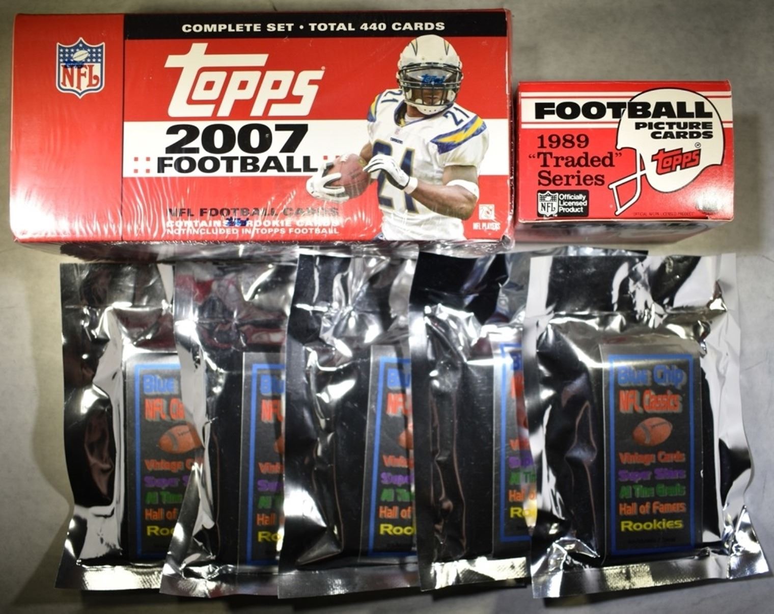 1989 TOPPS FOOTBALL "TRADED" SERIES MISSING AIKMAN AND SANDERS, 5- NFL BLUE CHIP CLASSIC PACKS EA INCLUDE VINTAGE, SUPER STARS, ALL TIME GREATS, HALL OF FAMERS, AND/OR ROOKIES, AND 2007 TOPPS COMPLETE FOOTBALL SET- SEALED.