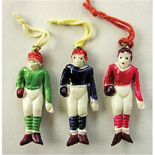 Tiny hard plastic football player charms, often attached to pin-back buttons as a decorative ?dangler?. Made in Japan, 1930s, 2? long.