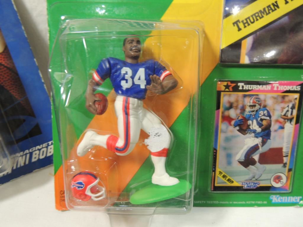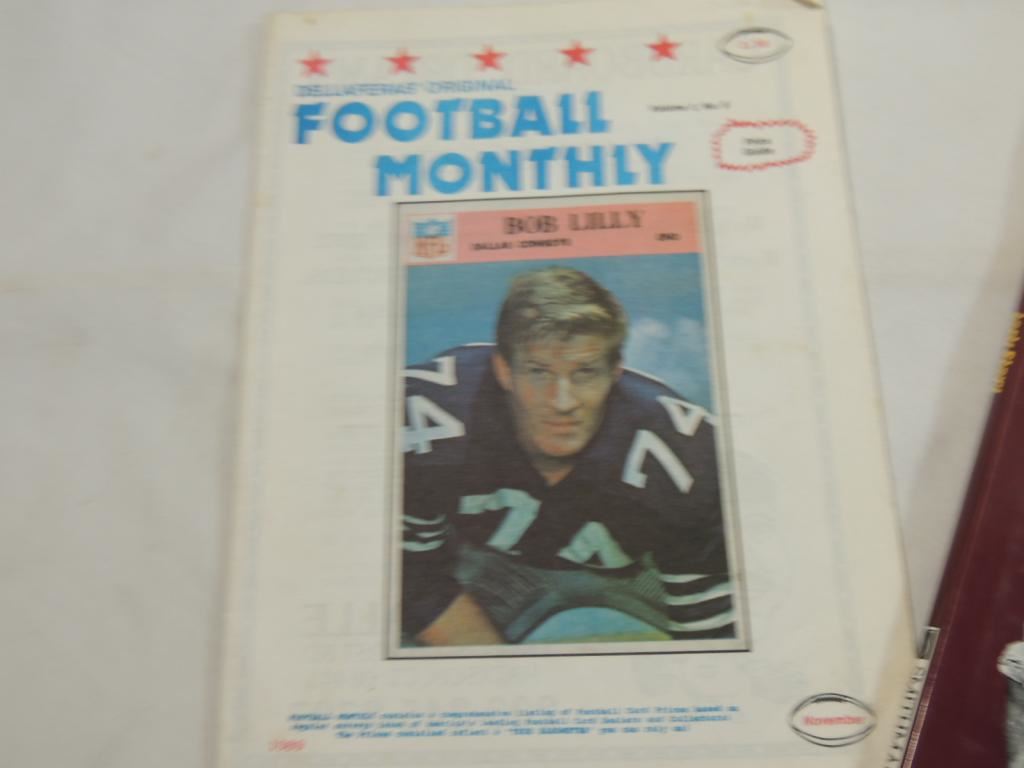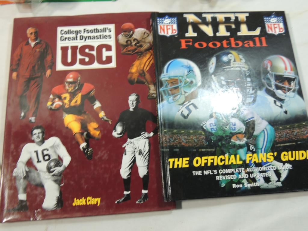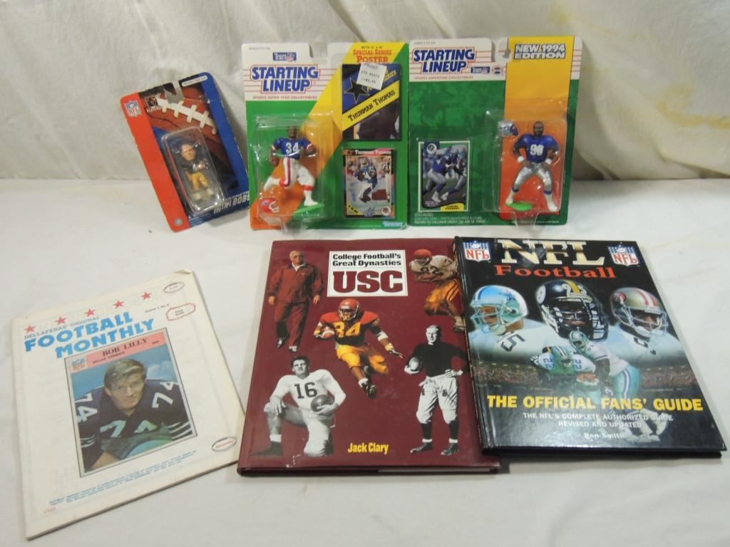 1989 DELLAFERAS ORIGINAL FOOTBALL MONTHLY PRICE GUIDE, NFL FOOTBALL THE OFFICIAL FANS GUIDE, COLLEGE FOOTBALLS GREAT DYNASTIES USC, STARTING LINEUP THURMAN THOMAS, STARTING LINEUP CORTEZ KENNEDY, MAGNETIC MINI BOBS FAVRE FOOTBALL COLLECTIBLES, FOOTBALL MEMORABILIA AS SHOWN SEE PHOTO FOR MORE DETIALS.