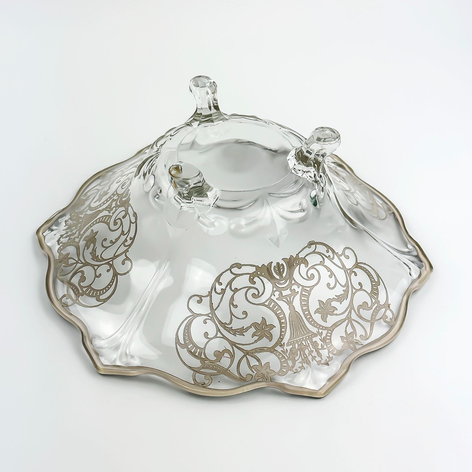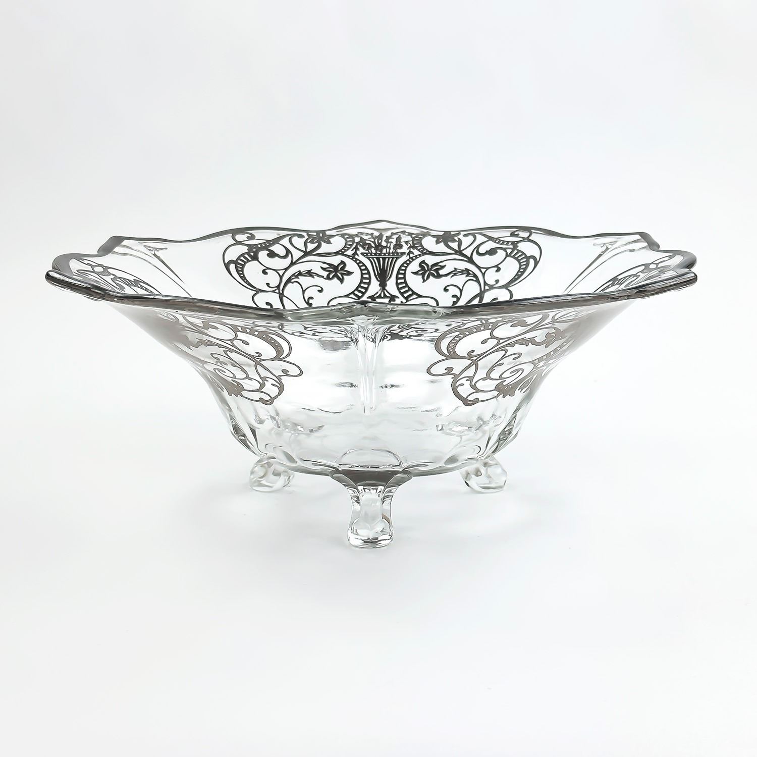 #8526 - VINTAGE 3-FOOTED GLASS BOWL WITH SILVER OVERLAY. MEASURES: 11.5” (29 CM) TOP DIAMETER AND SITS 4.5” (11.5 CM) HIGH