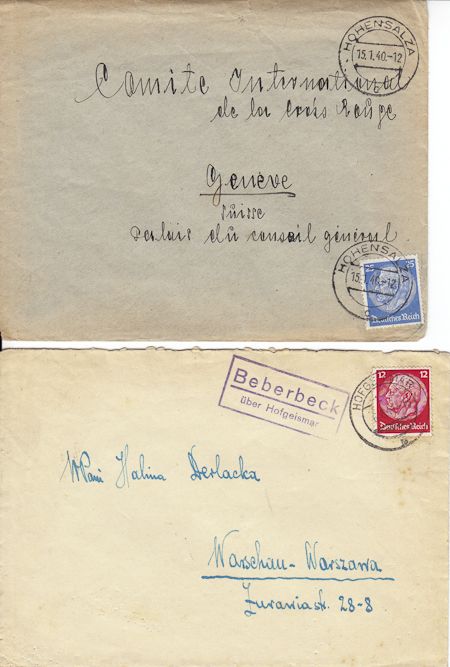 Lot of three items includes a postal cover addressed to an individual in Warsaw, canceled at Hofgeismar, site of a forced labor camp and later a DP camp, June 6, 1941; a postal cover addressed to the Red Cross in Geneva, canceled at Hohensalza, a transit and transfer camp, POW camp, and later Jewish forced labor camp, Jan. 15, 1940; and an officially reissued death certificate, 1p. 12mo., 1954, for Babette Paul, born Hirsch, who died at Theresienstadt on Mar. 31, 1943. Very good.