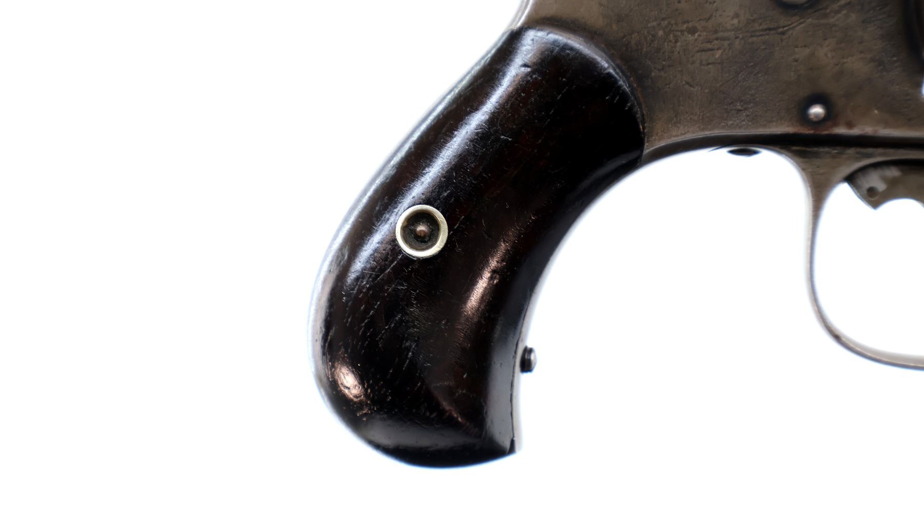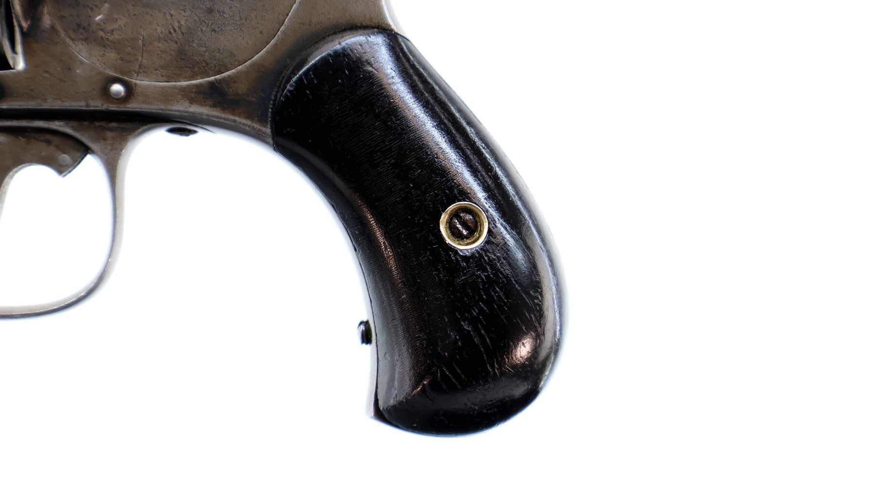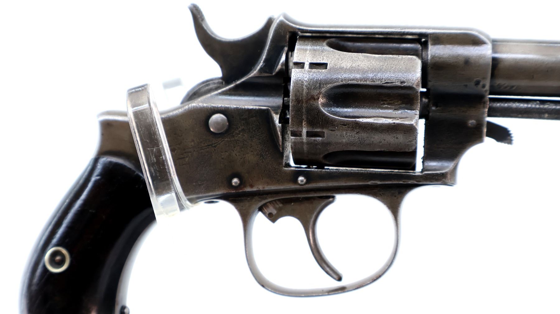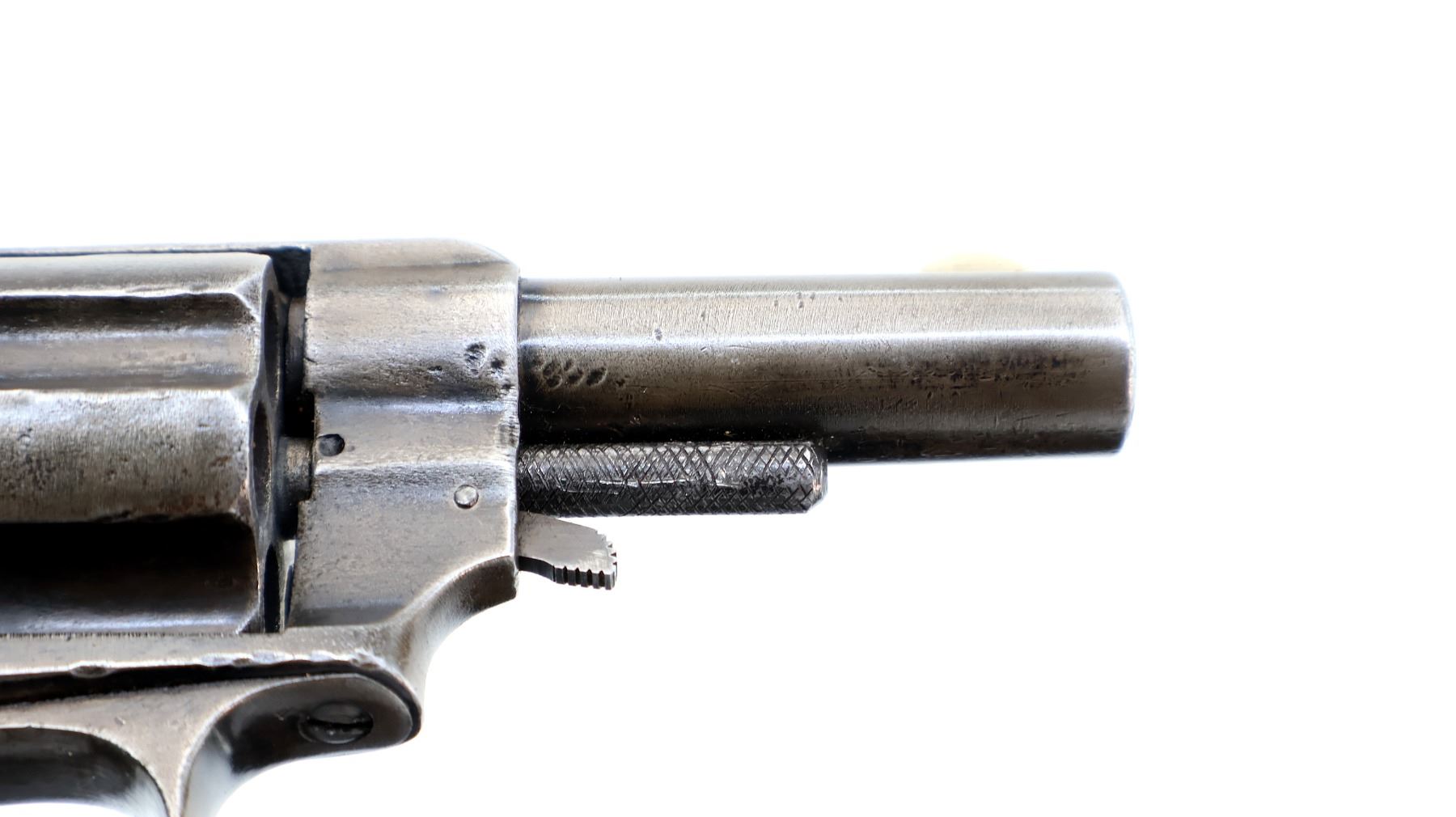 Main Description: Functions mechanically as designed. Blade front sight, fixed u notched rear sight, traces of blueing remaining, blued finish, fluted cylinder, loading groove on right side of frame, checkered spur hammer and smooth trigger. Two piece smooth wood grips