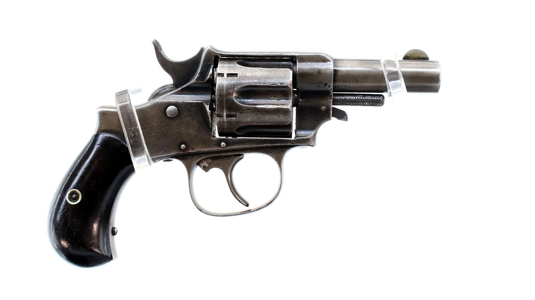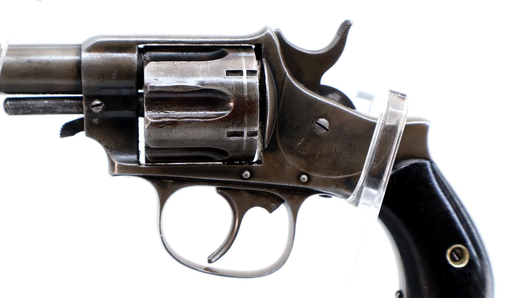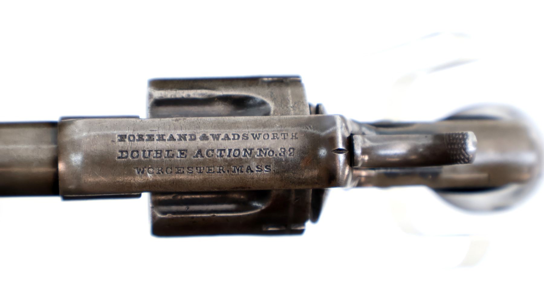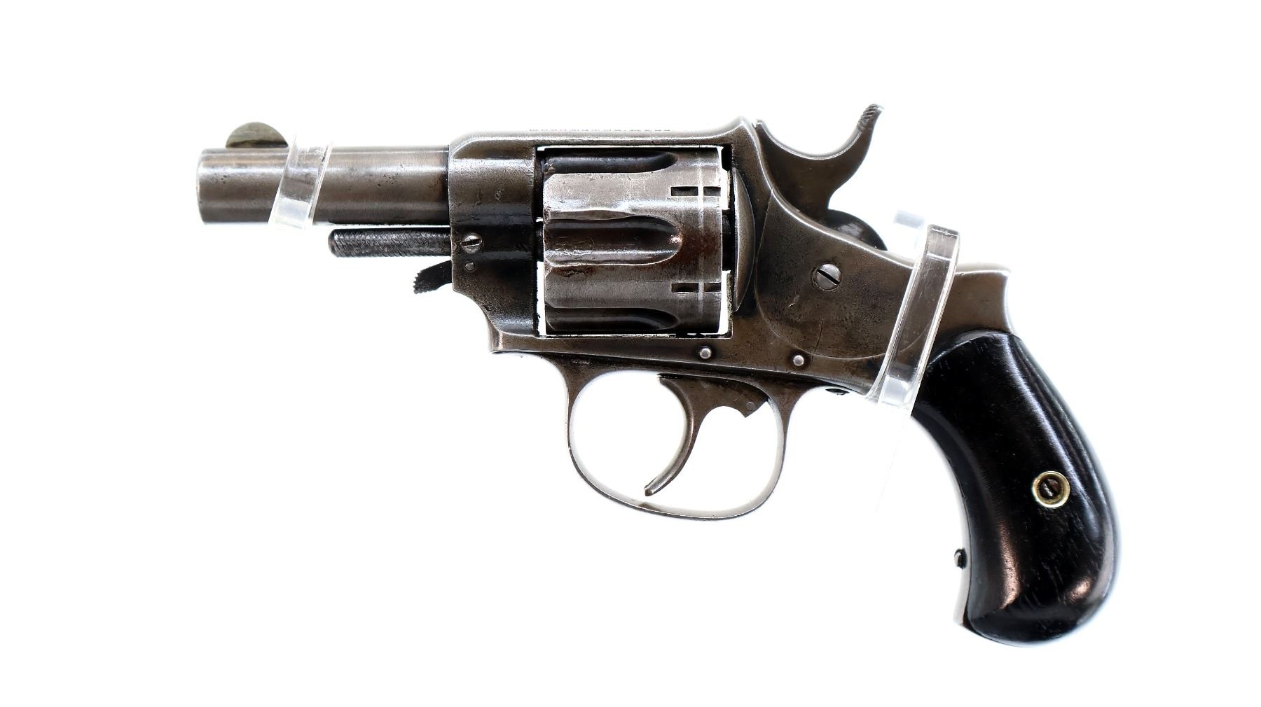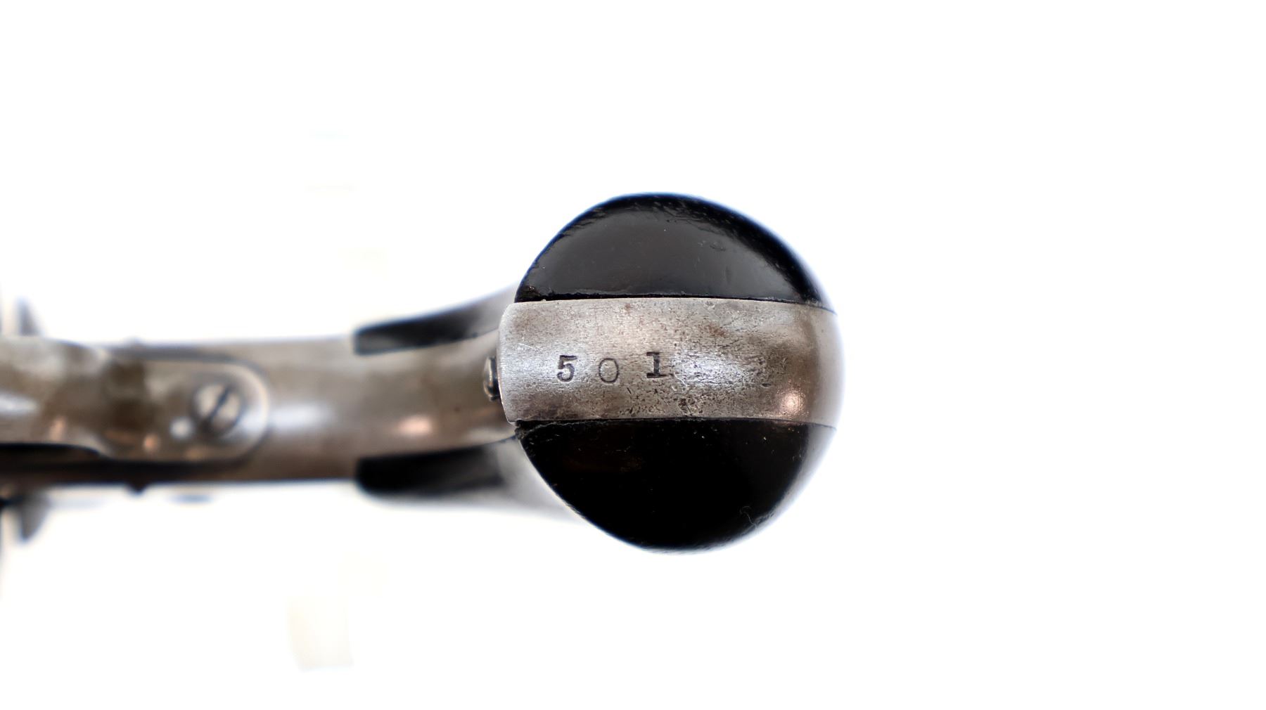 Main Description: Functions mechanically as designed. Blade front sight, fixed u notched rear sight, traces of blueing remaining, blued finish, fluted cylinder, loading groove on right side of frame, checkered spur hammer and smooth trigger. Two piece smooth wood grips