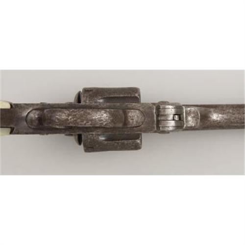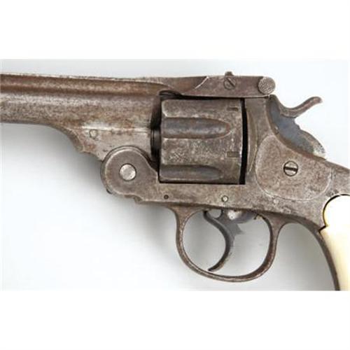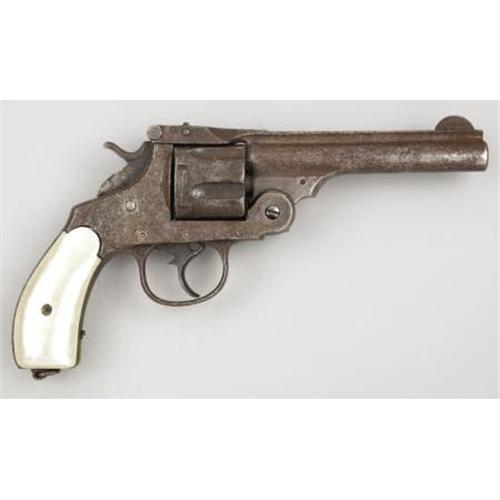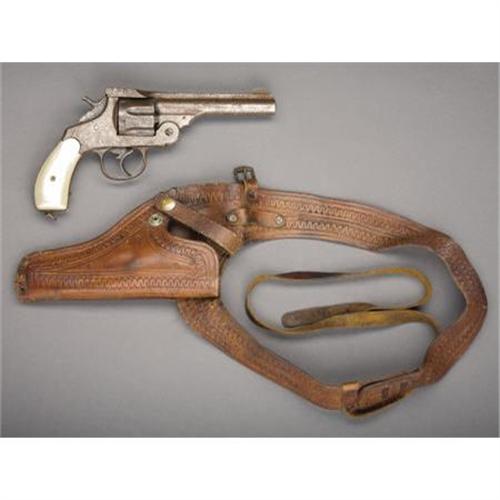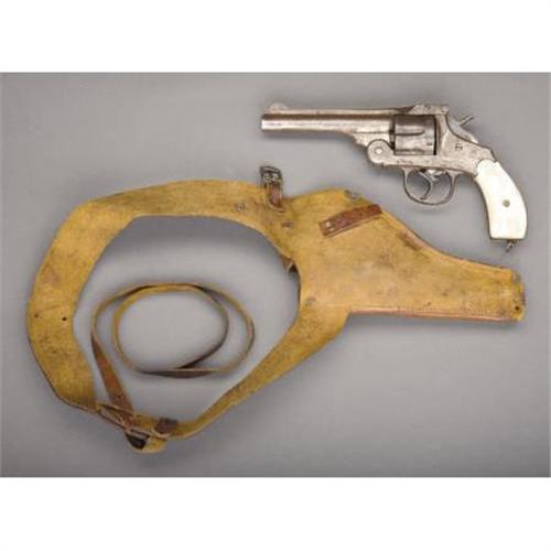 <B>FOREIGN COPY OF A SMITH AND WESSON DOUBLE ACTION REVOLVER</B></I> - Serial number 748, circa 1880-90s. 5" barrel in. .44 caliber. Top of ribbed barrel roll address reads: "SMITH AND WESSON CARTRIDGES AND THOSE THAT FIT BEST THE 'EUSKARO' REVOLVER". No other markings evident on exterior of revolver. Functioning action. One pearl and one painted hard rubber grip. Lanyard loop on butt. Accompanied by tooled shoulder holster rig. <BR><BR><B>Condition:</B></I> Grey to brown patina overall with scattered pitting and handling dents on metal surfaces. One side has a hard rubber grip, has been filed or sanded it smooth and painted it with a pearl colored paint to simulate the other pearl grip. The leather shoulder holster with this revolver is tooled with good wear and color. It is a nice holster that will date in the early 1900s.<BR><BR><b>Shipping:</b> Miscellaneous Collectibles, Larg (<a target="_blank" href="http://www.heritageauctions.com/common/shipping.php">view shipping information</a>)
