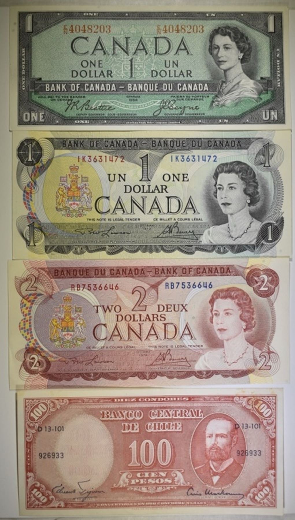 3-CANADA 1-GERMAN 10,000 KRONEN & 1-CHILEN NOTE ESTIMATE $75 - $85.