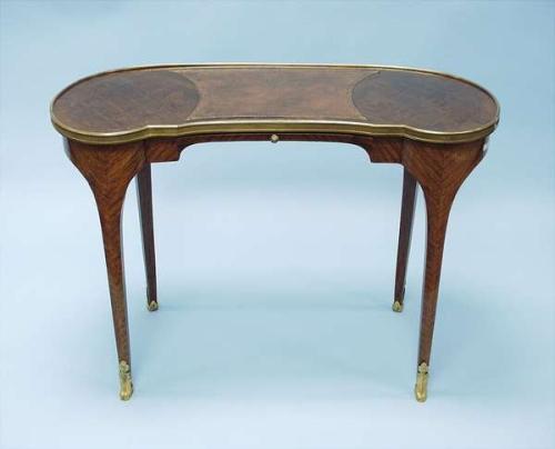 FOREST, PARIS. An antique French Louis XVI style, parquetry decorated, kidney shaped lady's desk. Apron with pull out writing plate and top, inlaid with gilt embossed brown leather writing surface. Marked with metal plaque. 38 1/2" wide, 17" deep and 26 1/2" high. 9000-10000