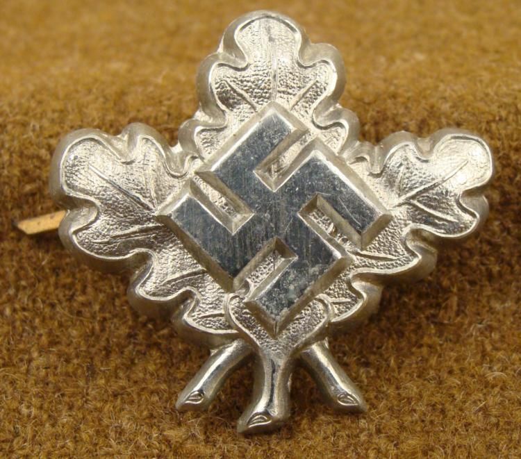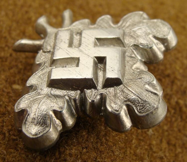 FORESTRY OFFICIAL'S VISOR INSIGNIA * SILVER TRIPLE OAK LEAVES WITH LARGE SWASTIKA CENTER-NICE ORIG--BOTH PRONGS ON REVERSE *