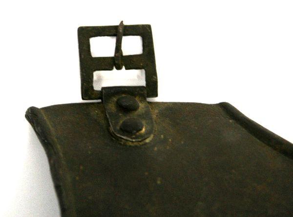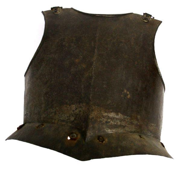 Forged hammered iron armor breast plate. Buckles at top of shoulders. Remnants of deteriorated leather straps under rivets along bottom. Exact age and origin unknown. Measures approximately 18 inches high, and 14 wide.