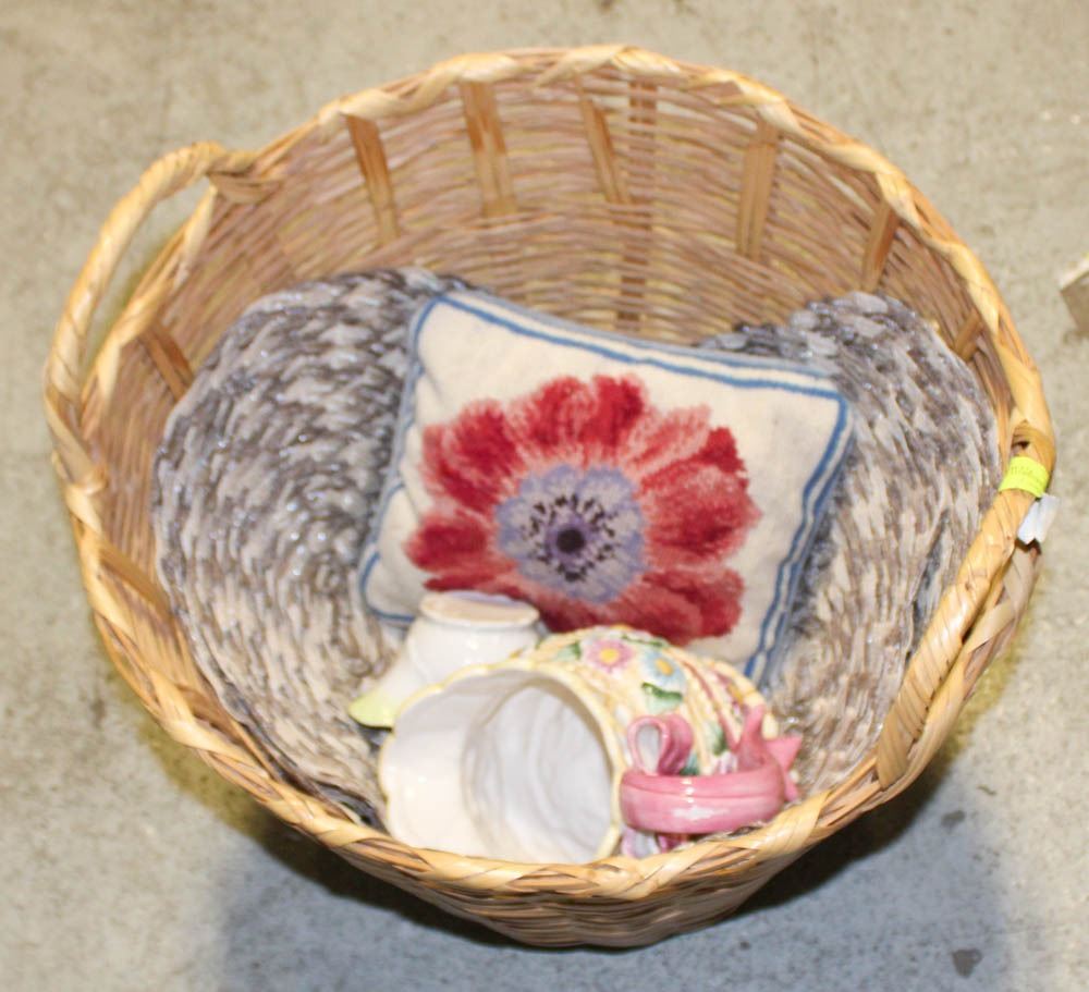 BOWL + DAISY HANDMADE CERAMIC PITCHER/JUG, SET OF MATCHING ROUND PLACEMATS, HANDMADE CROSS STITCH/PETIT POINT DECORATIVE PILLOW + ANTIQUE TEA STRAINER POT
