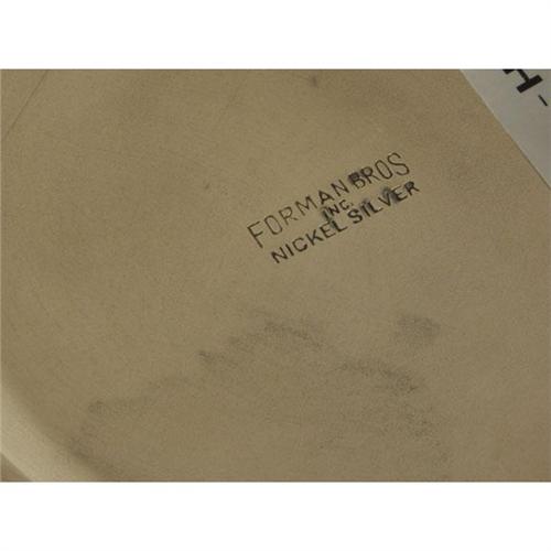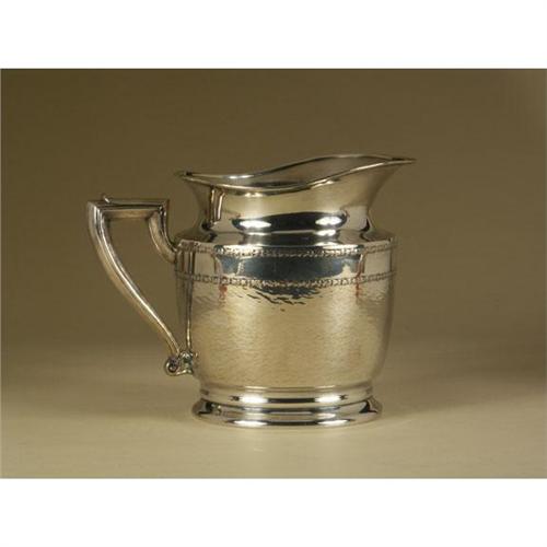 SILVER PLATE: A hammered nickel silvered water pitcher, rolled edge, applied handle, Doric base, hallmarked Forman Brothers, 7'' high and 9'' from outer edge of the handle to tip of the lip. Note: No dents but some minor surface scratches noted.