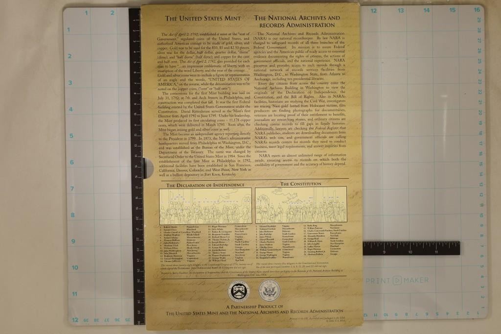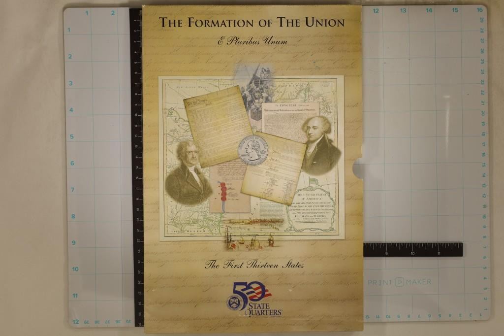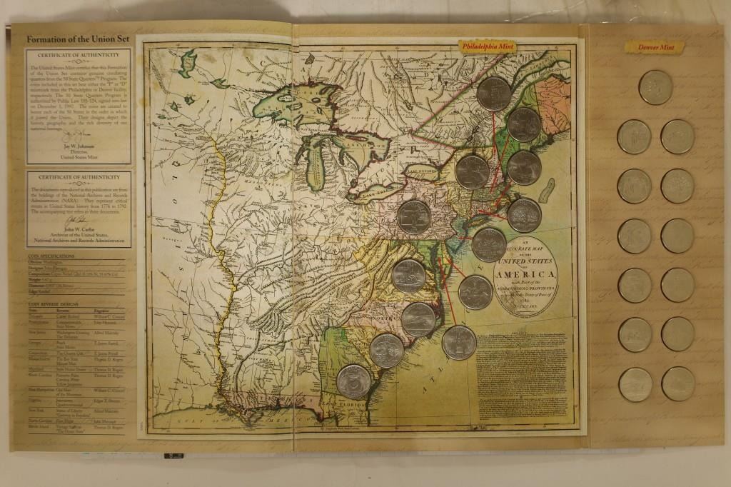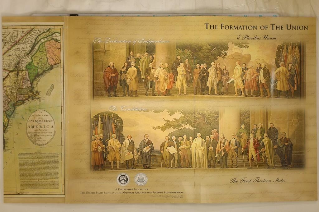 SET. 26 COINS FROM THE ORIGINAL 13 STATES. 13 FROM EACH P & D MINT MARKS. HOUSED IN INFORMATIONAL FOLIO IN PARTNERSHIP OF THE US MINT AND THE NATIONAL ARCHIVES AND RECORDS ADMINISTRATION.