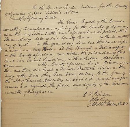 Manuscript D.S., 1p. legal folio, Lycoming Co., Pa., April, 1844, a court document in which a "Grand Inquest" finds: "...Hiram Mudge...at the Burough of Williamsport...did commit Fornication, with a certain Mary Jane Davis...aforesaid Single Woman, and then and there did begat a Female Bastard child on the body of the said Mary Jane Davis...against the peace and dignity of the Commonwealth of Pennsylvania...". Interestingly, it appears that Mudge was an elder of the Third Presbyterian Church in Williamsport and headed the Sunday school there...Very good.