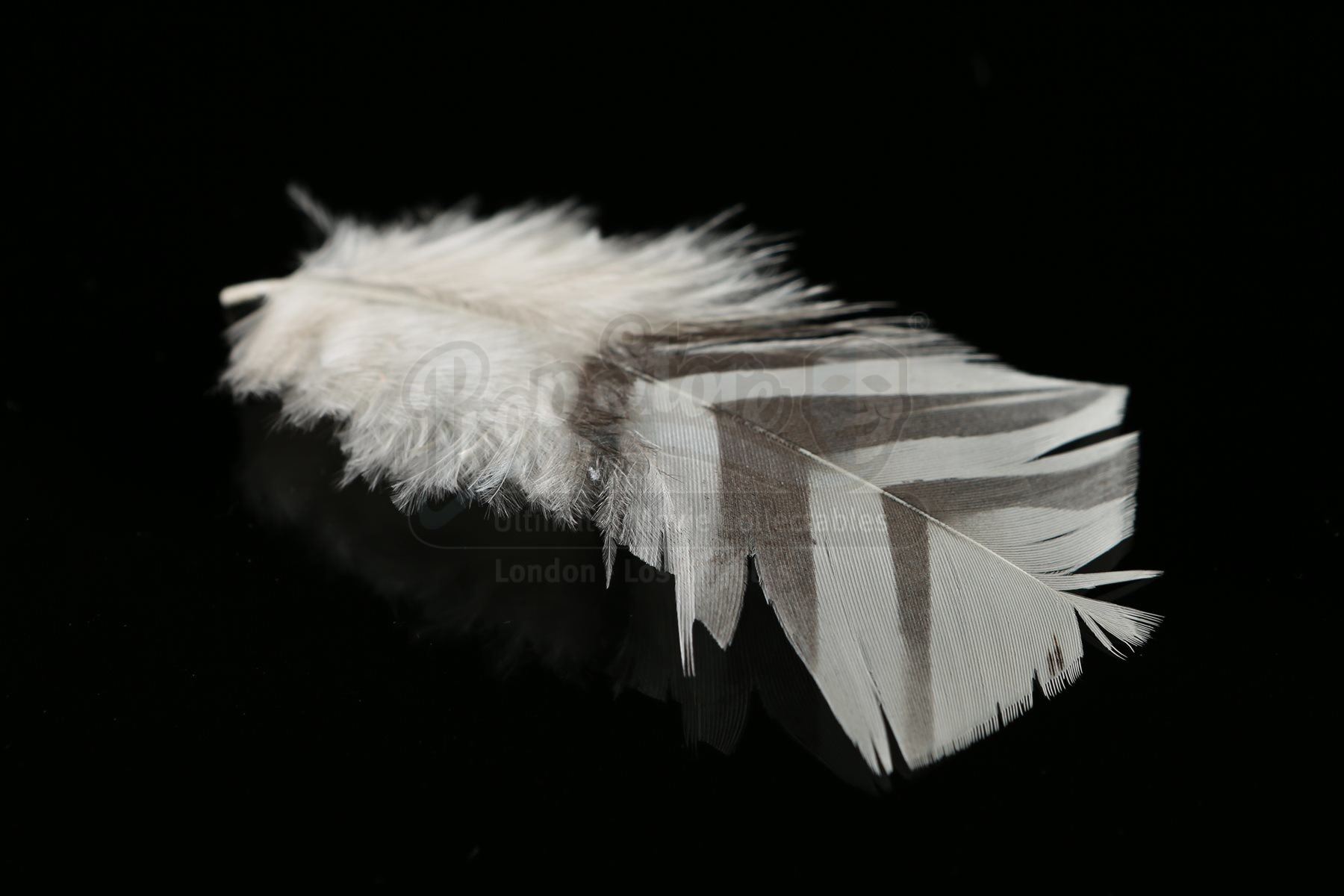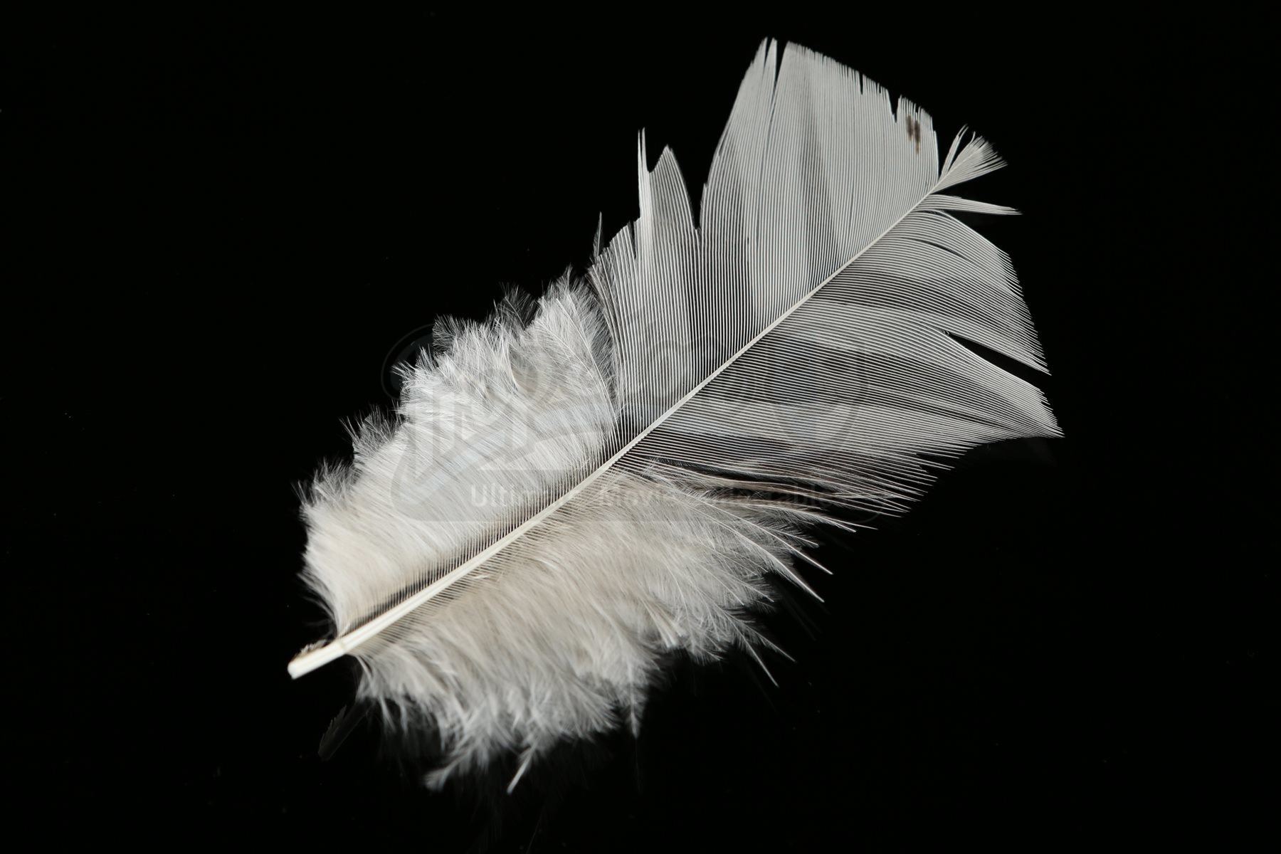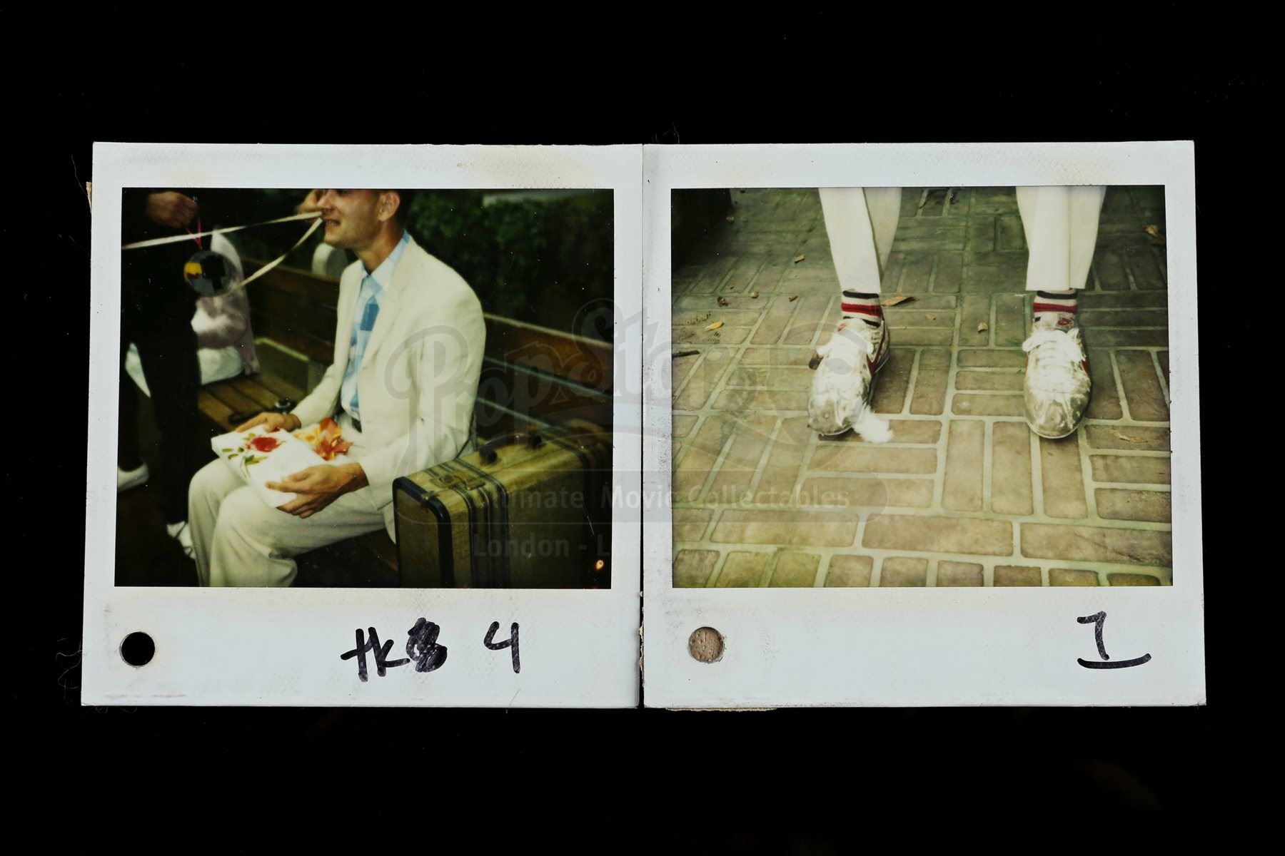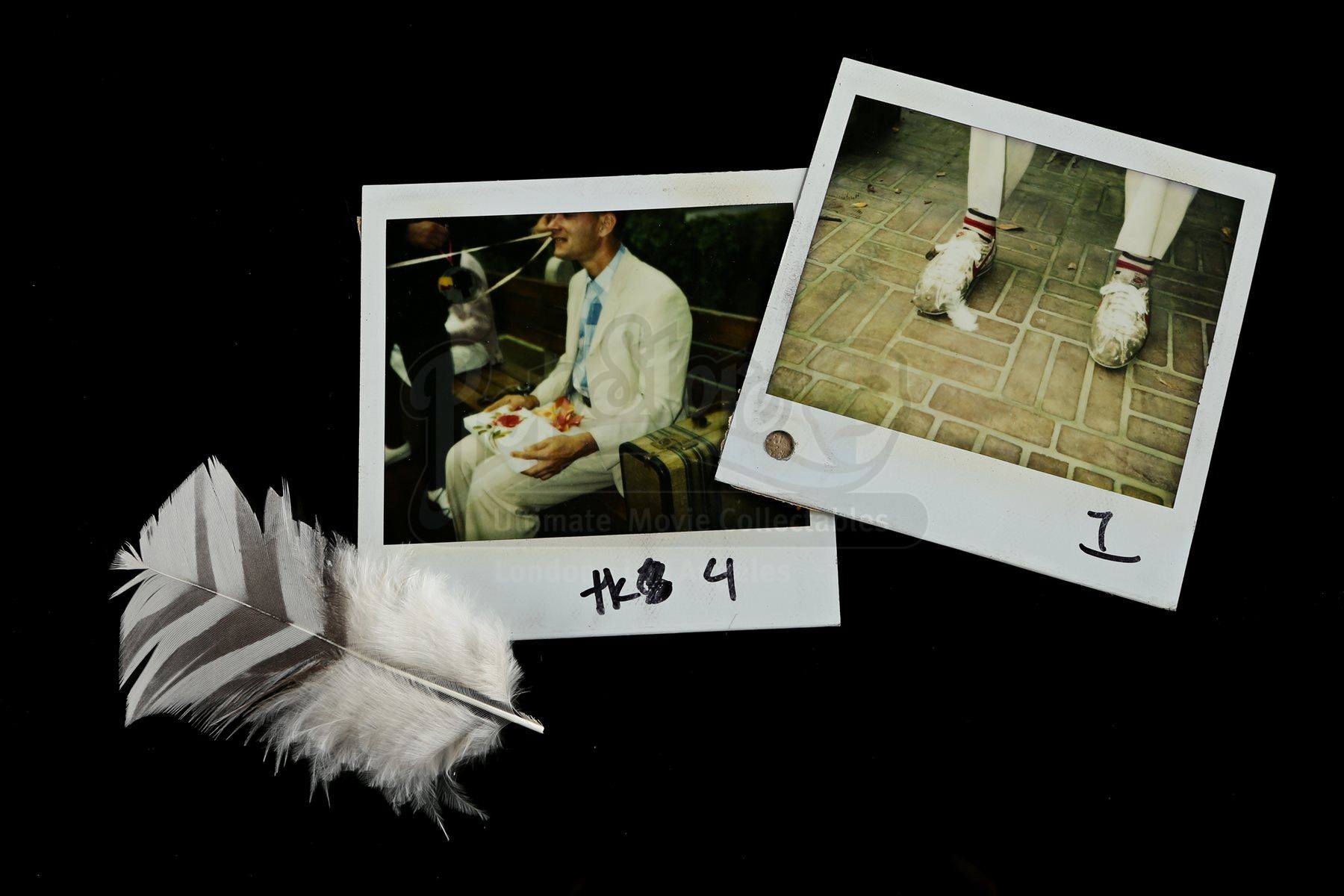 Forrest Gump’s (Tom Hanks) feather and a pair of continuity photographs from Robert Zemeckis’ Academy Award®-winning drama Forrest Gump. During the film’s opening scene, a feather fell at Forrest’s feet. Though a computer-animated feather was created for shots showing motion, a real feather was placed by Forrest’s feet for him to interact with. This feather screen-matches to the one held by Forrest on the park bench.