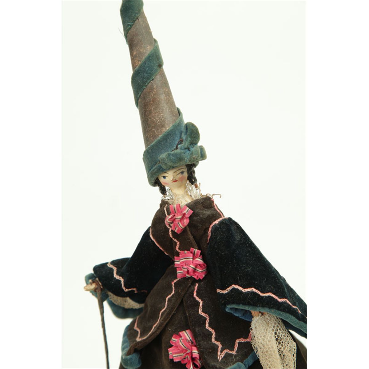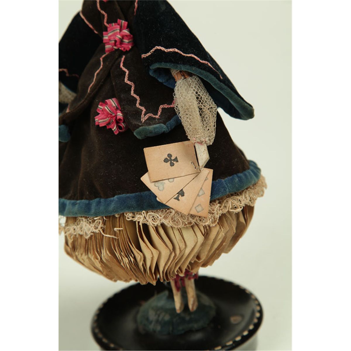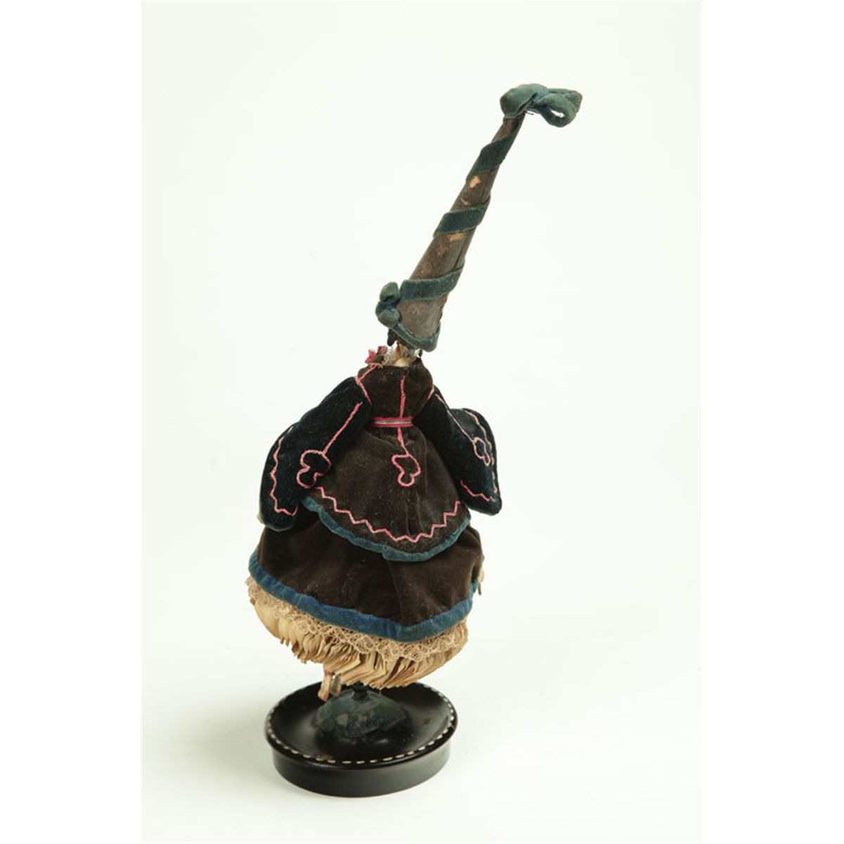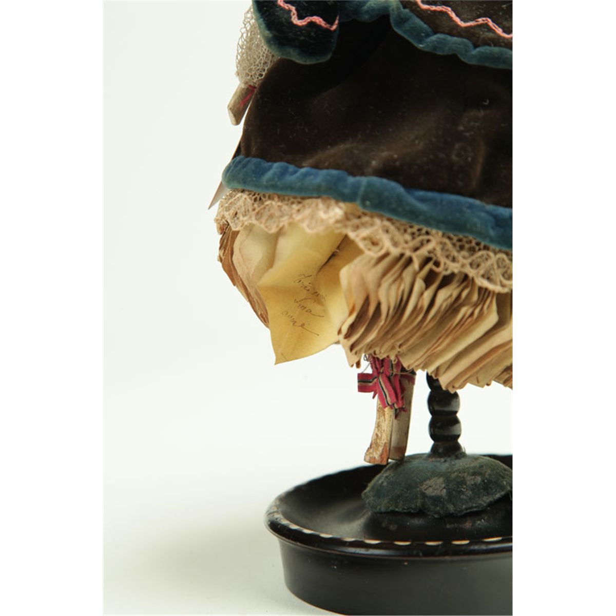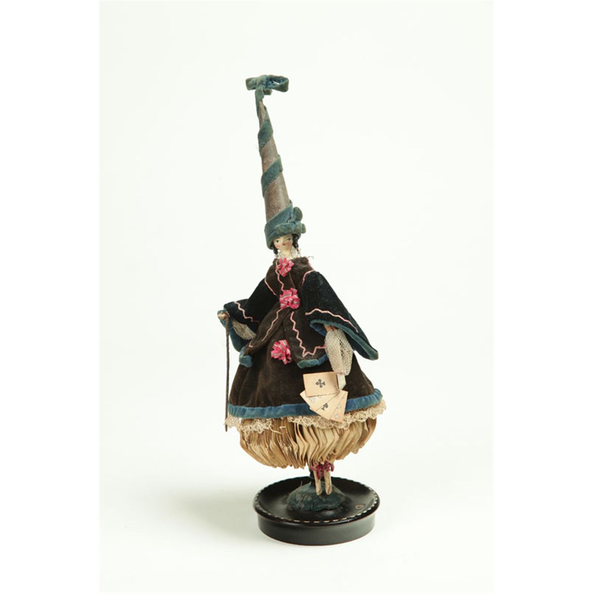 France, 19th century, paper and fabric. Velvet hat and dress. The form is comprised of dozens of folded slips of paper, on each is written a fortune. At a party, guests would pull out a piece of paper to find out their fortune. Mounted on a turned and painted base. 13"h. Ex David Good (Ohio).