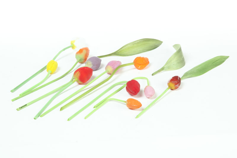 Germany, early 20th century. Blown glass tulips in painted shades of yellow, white, pink. lavender, orange and red. Some stems stamped "Germany". A few holes. 7 1/2" to 10 1/2"l.