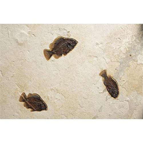 <B>FOSSIL FISH PLATE</B></I><BR> <I>Priscacara liops</B></I><BR><I>Eocene<BR>Green River Formation, Wyoming</B></I><BR>A classic example, not only of this distinctive inhabitant of the Green River Fossil Lake system, but also of the excellent preservation to be found in the fossil record there. The <I>Priscacara liops</B></I> was the smaller of the two species in this genus (the other being the <I>Priscacara serrata</B></I>). Their name means "primitive head" and both species are immediately recognizable from the characteristically spiny dorsal and anal fins that may well have been a defense against being swallowed from behind. It was a schooling fish, and we have here three particularly fine examples, "swimming" gracefully across the pale limestone matrix. The largest is 5¾ inches long and the matrix is mounted in a stained wooden frame measuring 27 ½ x 23 ½ inches and ready for hanging.<BR><BR><b>Shipping:</b> Requires 3rd Party Shipping (<a target="_blank" href="http://www.heritageauctions.com/common/shipping.php">view shipping information</a>)