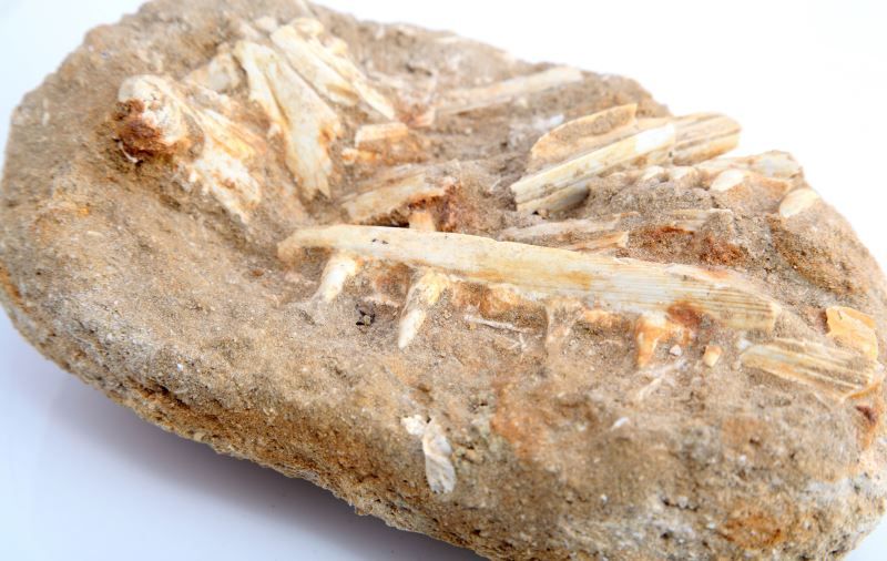 Fossilized teeth and jaw fragments of a mid to small sized predatory dinosaur, partially exposed in mass of sedimentary rock. Measures approximately 7 by 5 inches.