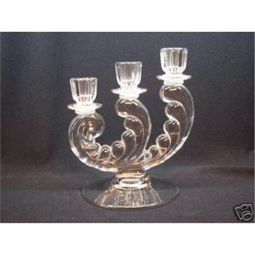 This is a beautiful candle stick made by The Fostoria Glass Co. circa 1940-72. This is Fostoria's No. 2594. The design is like three ocean waves crashing to shore or three fern fronds opening. This candlestick has a very unique feel and look due to the excellent quality of glass used. It was made by The Fostoria Glass Co. circa 1940 to 1972. The original name is Pattern #2594. This 3 lite candle stick is 8" tall and 7" wide. The foot is 5-1/2" in diameter. The candle stick is in excellent condition with no chips, cracks, scratches or flakes. There is no etching on on the base of this beautiful glass candle holder.