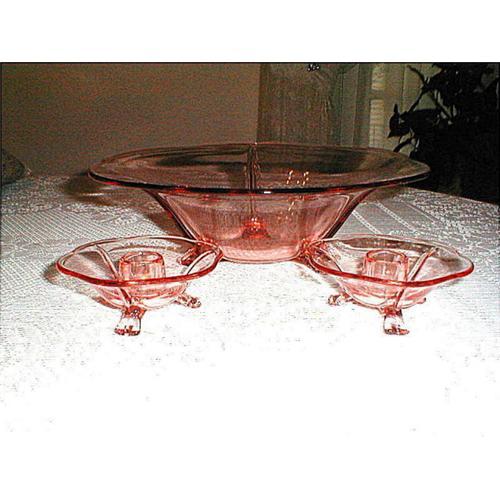 THIS IS A LOVELY 3 FOOTED CENTER BOWL AND MATCHING CANDLESTICKS IN THE ROSE (PINK) COLOR BY FOSTORIA WHICH WAS PRODUCED BETWEEN 1928 TO 1944. THIS BOWL MEASURES 4 IN. TALL AND 12 IN. IN DIAMETER AND THE CANDLESTICKS EACH MEASURE 2 IN. TALL AND 4 1/2 IN. IN DIAMETER. ALL PIECES ARE IN VERY GOOD CONDITION WITH NO CHIPS, CRACKS, OR REPAIRS.