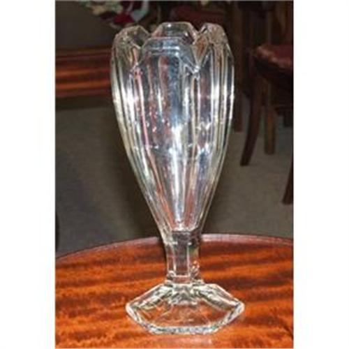 This is an elegant vase by Fostoria Glass Co. The early pattern is Alexis and was made from 1909-1920. A long lived product of a major company now out of business. It is a pattern that bridges the gap from pattern glass to depression glass. It is footed and 9"tall, clear glass in very good condition with no cracks or chips. It has a few minor scratches.
