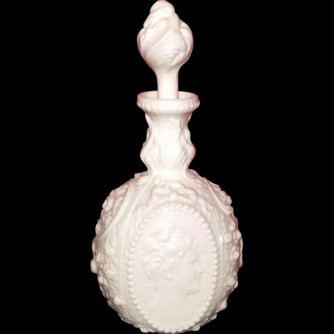 For your consideration is this exquisite Fostoria Jenny Lind milk glass cologne bottle/decanter with a stopper in wonderful condition. The piece features a cameo design with high relief on both sides and measures about 11 1/2" tall including the stopper. The decanter displays beautifully with no chips, cracks, repairs. A great addition to any collection!
