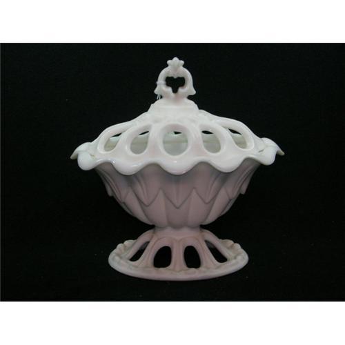 This is an elegant opaque white Milk Glass Franklin Urn #3693 by Fostoria Glass in their Garden Center Collection. This is a version of a wedding bowl and can also serve as a candy or nut dish. Since it is from the Garden Collection it could also be used as a Crocus bowl to great effect. It was made circa 1960-1964 and is seen on page 255 of Fostoria Tableware 1944-1986, by Long and Seate. It is in mint condition and has a matte or frosted finish. It also comes with a glossy fire polished finish but I only have the matte in stock at this time. The covered bowl is 9? to the top of the finial. The oval bowl is 8-1/2? long by 5-1/2? wide at the wavy scalloped rim and the foot is 5-3/4? x 3-3/4? in diameter. This is a fantastic piece of milkglass for any collection. There are no chips, flakes or cracks. I also have another one to make a fine pair for the mantle of the fireplace.