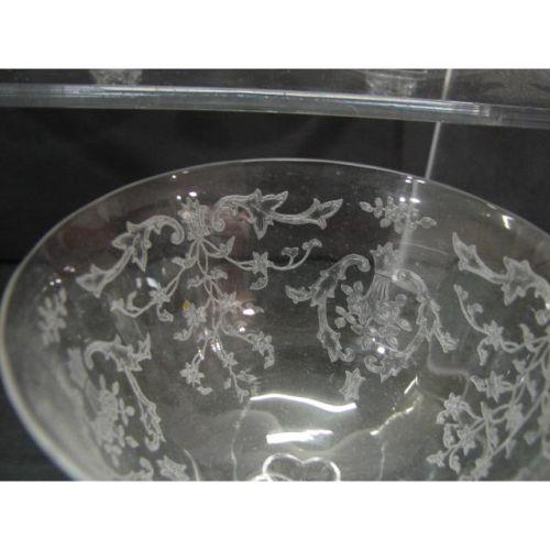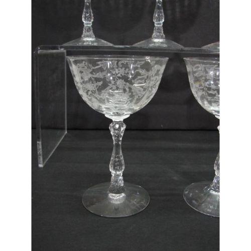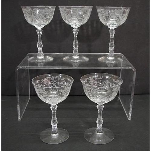 SET OF 5 FOSTORIA NAVARRE WINE GLASSES. Floral etched decoration around tops. 5.5” H