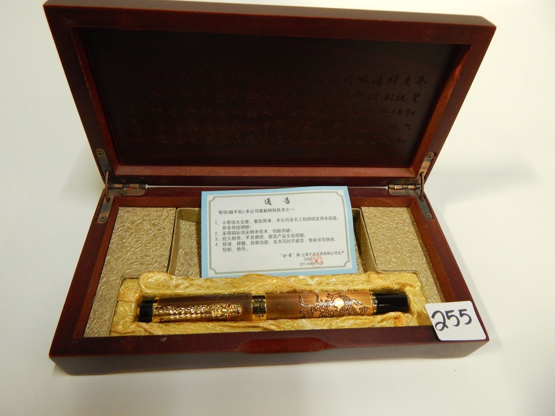 JINHAO CHINESE 18 K DRAGON FOUNTAIN PEN IN ORIGINAL MOHOGANY BOX/ TAN & GOLD