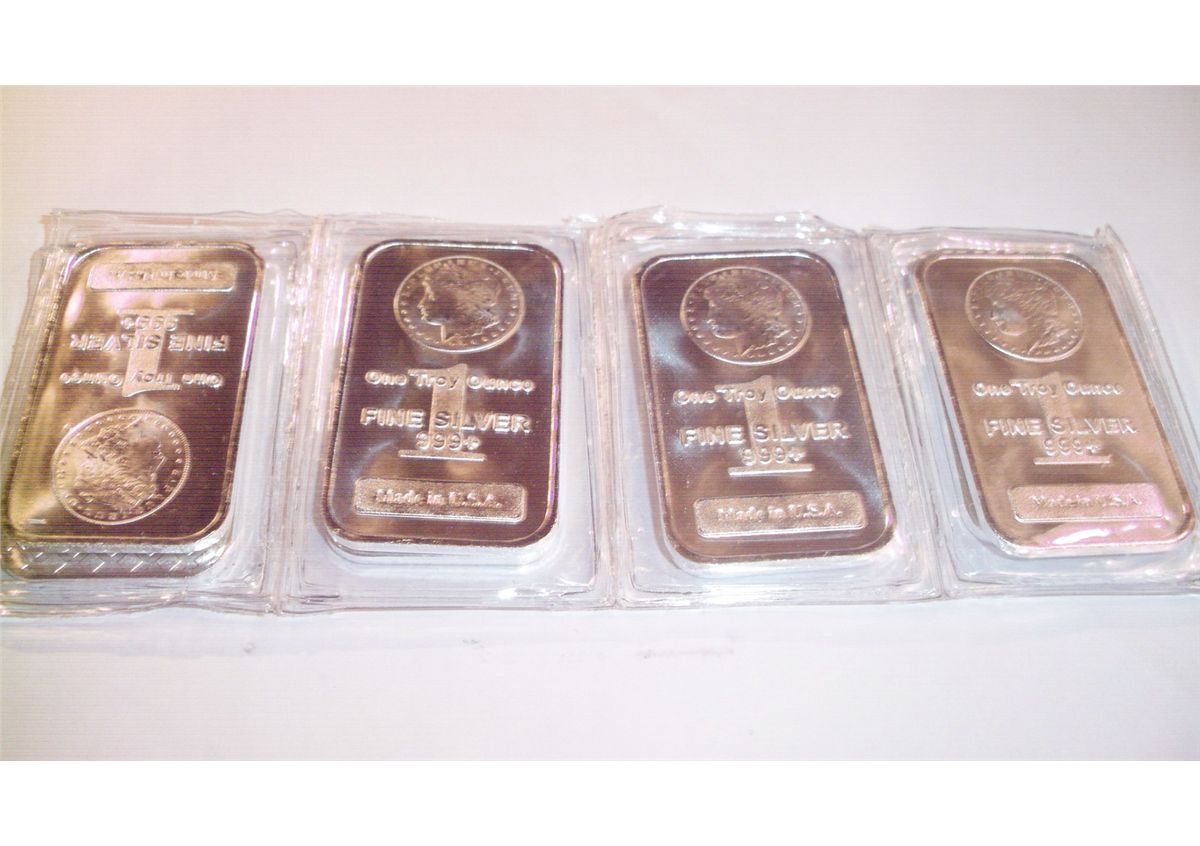 FOUR 1 OZ .999 PURE SILVER BARS W/MORGAN DOLLAR DESIGN