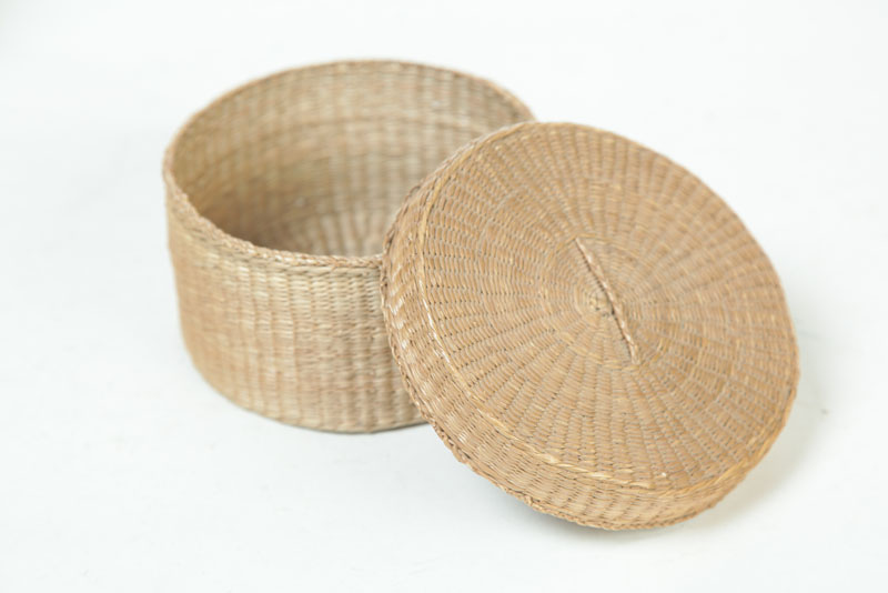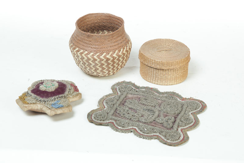 FOUR AMERICAN INDIAN PINCUSHION, PAD, AND BASKETS.