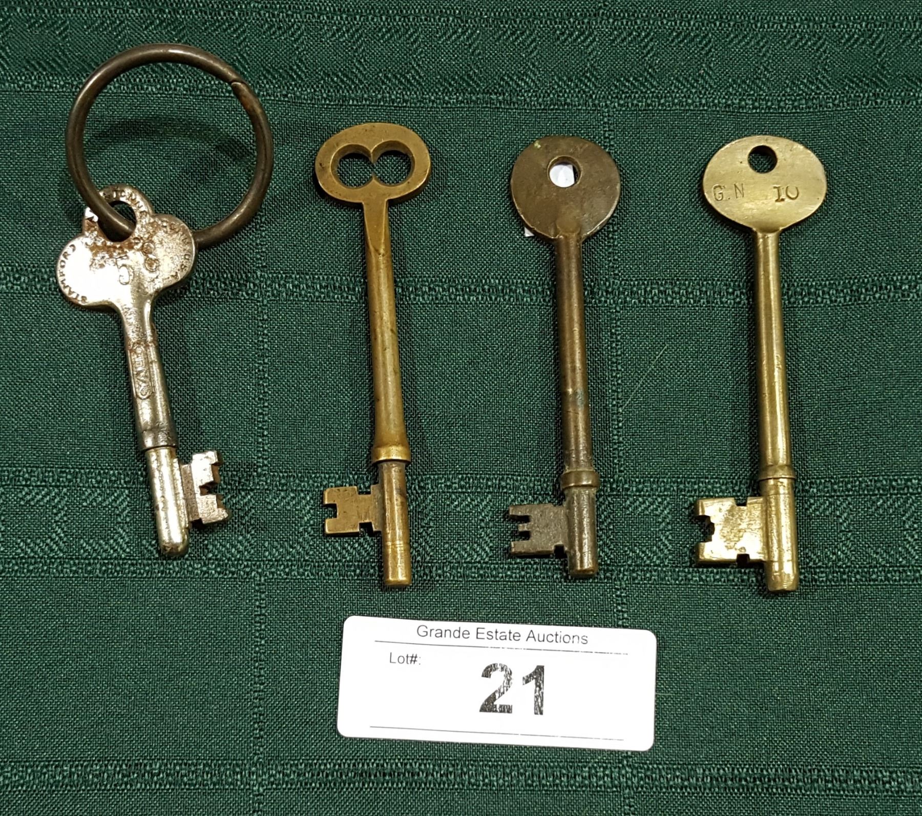 FOUR ANTIQUE HOTEL ROOM SKELETON KEYS