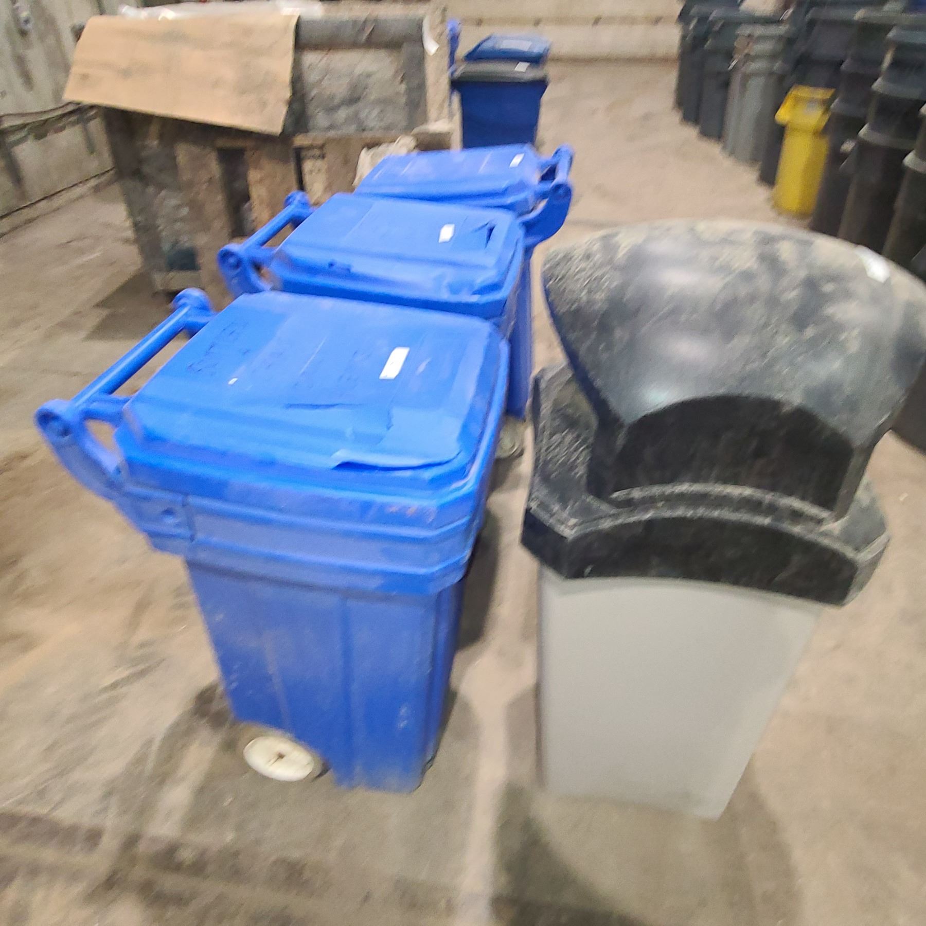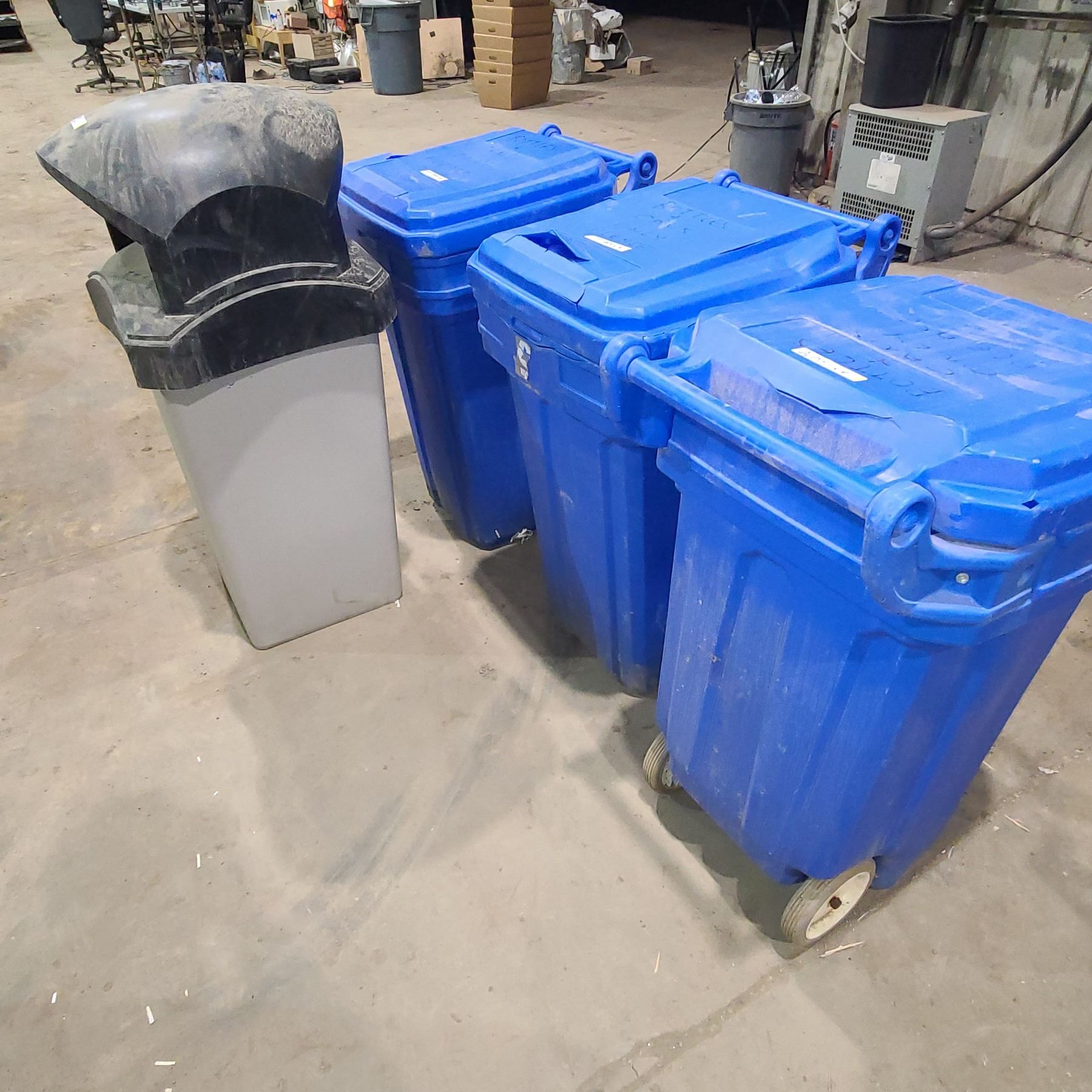 FOUR ASSORTED TRASH CANS SOME DAMAGED