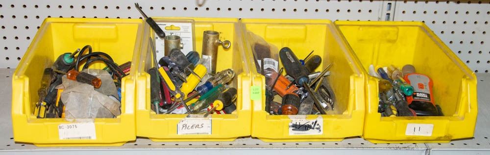FOUR BINS OF ASSORTED HANDTOOLS AND HARDWARE