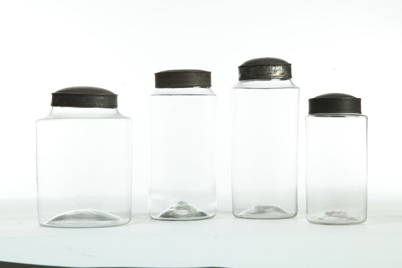 FOUR BLOWN GLASS STORAGE JARS WITH TIN LIDS