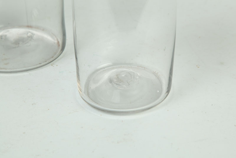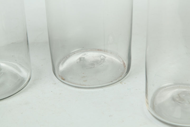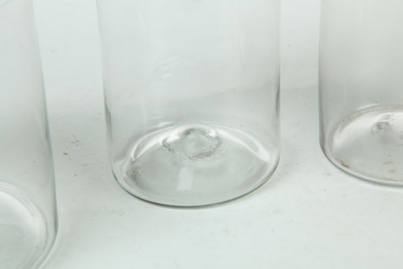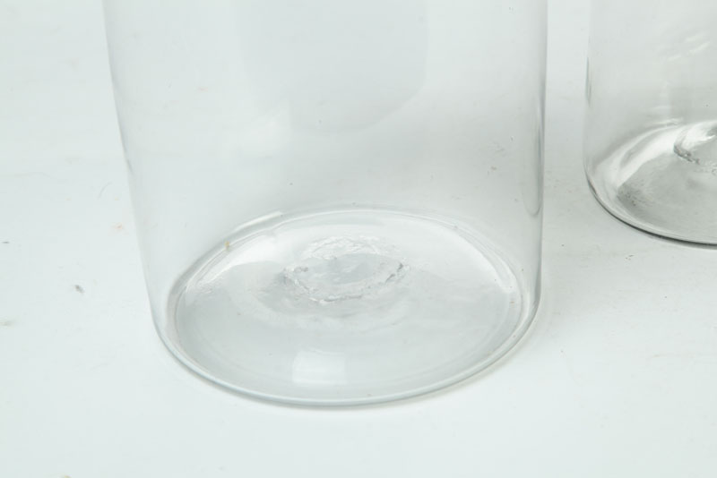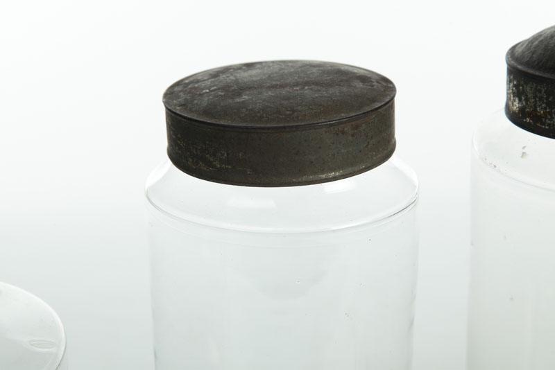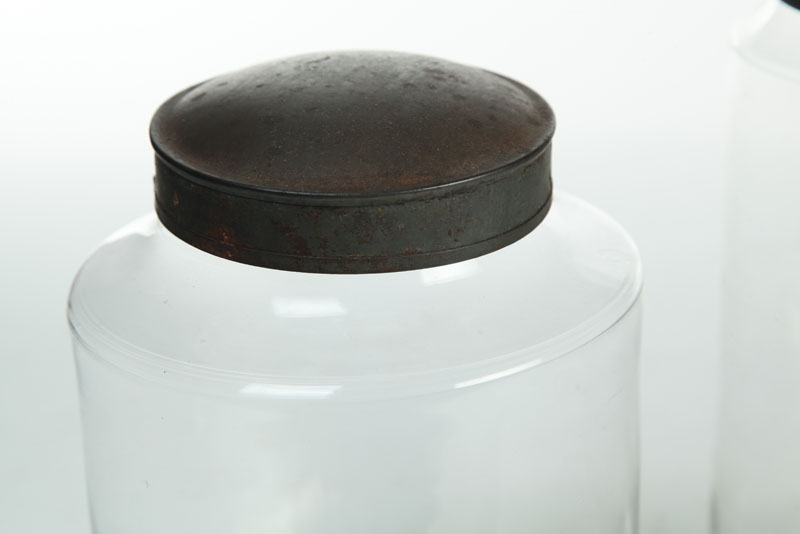 American, mid 19th century. Clear glass canisters with tin lids. Imperfections. 8"h. to 10 1/2"h.