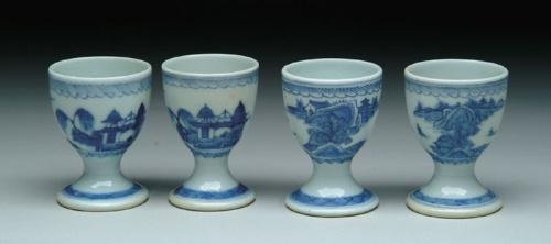 FOUR BLUE AND WHITE CANTON FOOTED EGG CUPS. SIZE: 2-3/4in. h. CONDITION: Very good. 9-26090