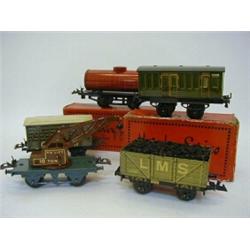 FOUR BOXED HORNBY SERIES WAGONS, American Type Tank Car, Milk Traffic Van, Crane Truck and Guard's Van, four boxed track sections and a Bing LMS open wagon (9) 50-80