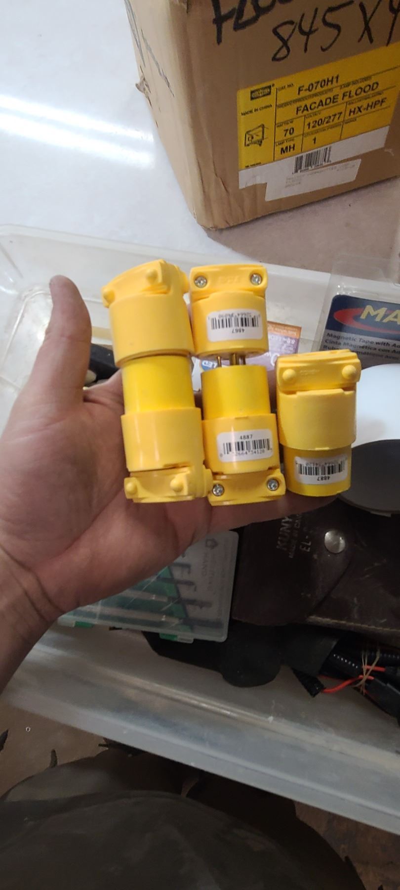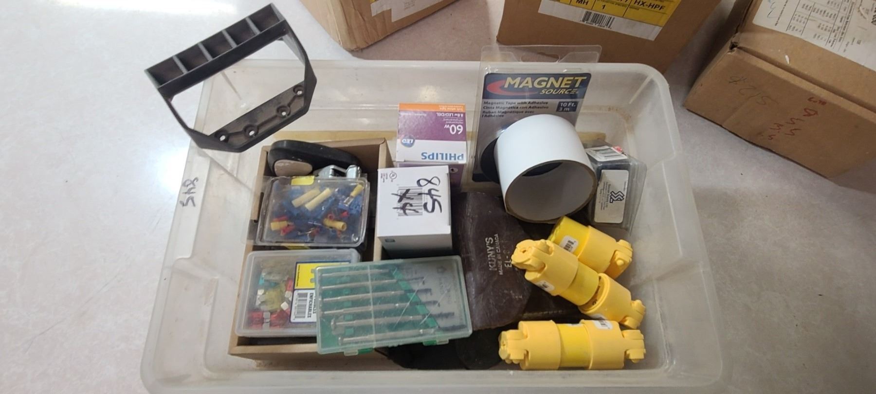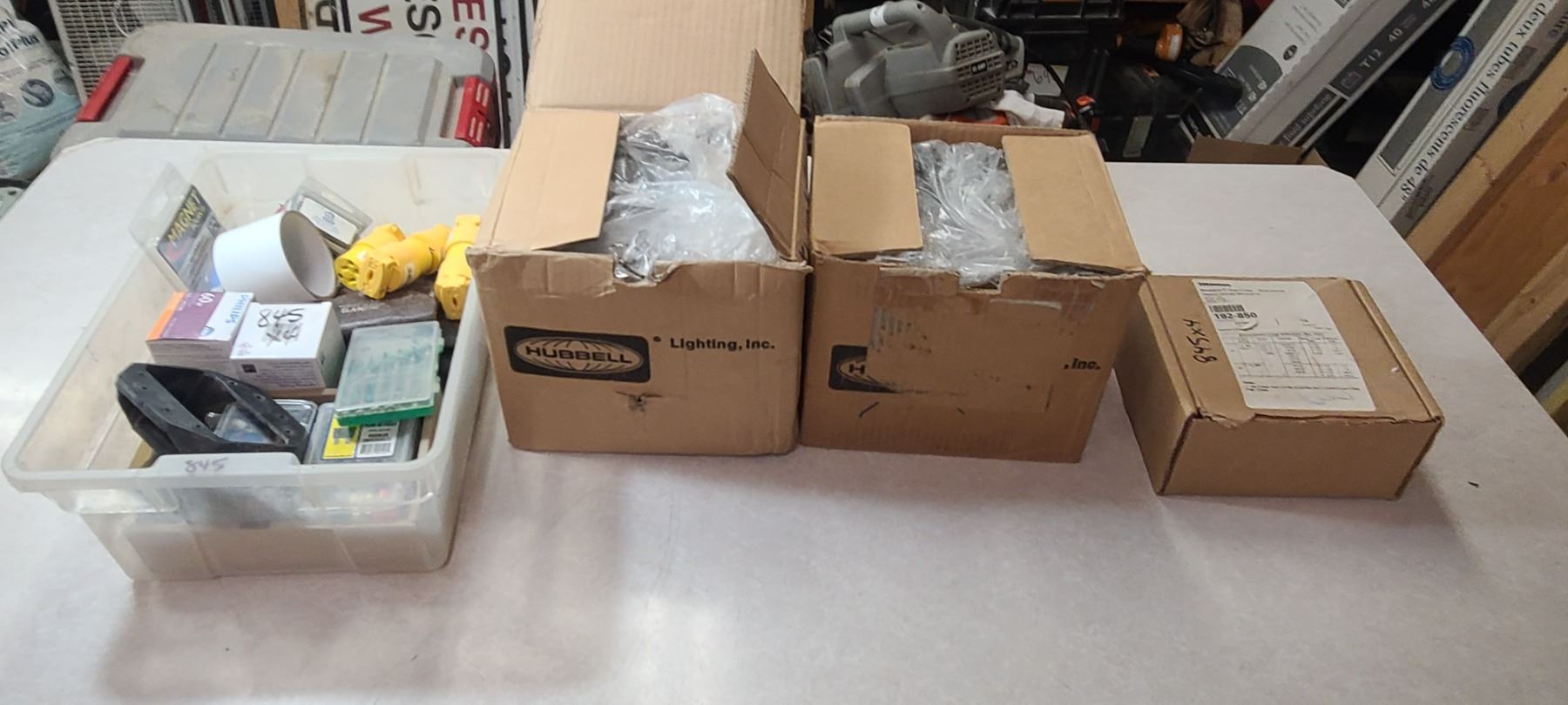 FOUR BOXES OF MISC ELECTRICAL SUPPLIES AND TWO YARD LIGHTS - SIEMENS 192-850 RETRO STAT