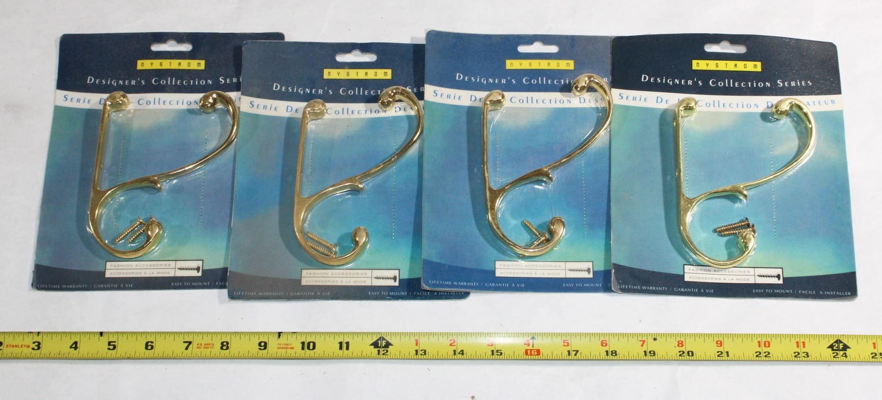 FOUR BRASS FINISH COAT/ HAT HOOKS