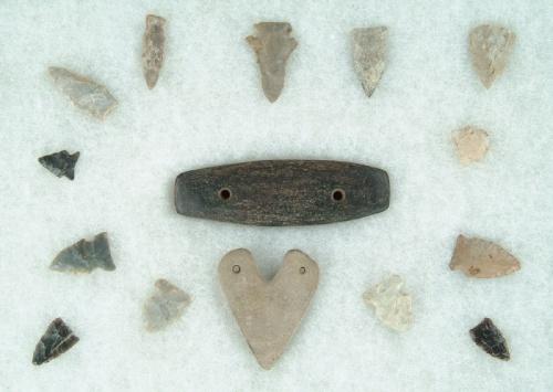 FOUR CASES OF VARIOUS STONE TOOLS. Poor to fair. 2) Various stone tools. Broken to fair. 3) Frame of stone tools. Broken to fair. 4) Framed stone tools with gorget and heart shaped pendant. Various times. Good. CONDITION: As noted above. 9-25984-115 The Tennessee Collection of Prehistoric Indian Artifacts from the Allen Graves Estate. SPECIAL NOTE: We do not regularly sell Prehistoric Indian stone artifacts and therefore have very little experience and no expertise in this area. All of the following lots have come from the Collection of the Late Allen Graves of Tennessee. The collection was inherited some years back by his daughter, who now lives in Maine. This collection was consigned to us directly from her. We employed someone to generally identify styles and types, but as stated above, due to our lack of expertise in this field, we can not guarantee the age or origin of the following pieces. We are relying on you, the buyer, to determine to your satisfaction the origin and age of each item in the collection.